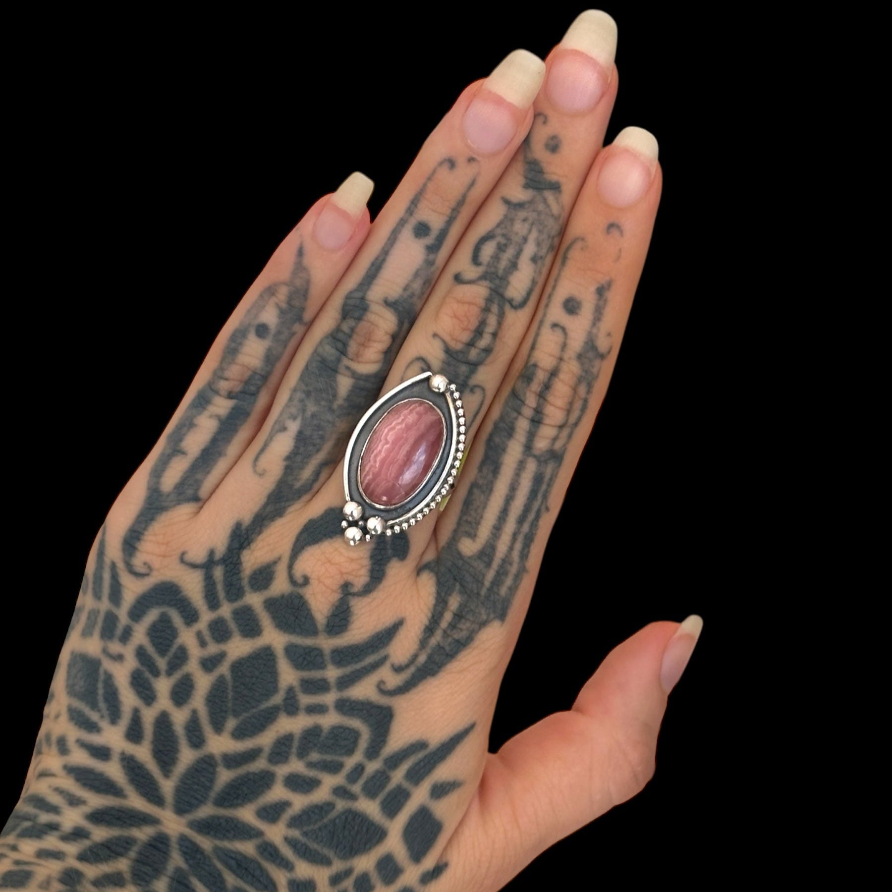 Anillo hecho a mano en plata de ley con Rodocrosita natural.