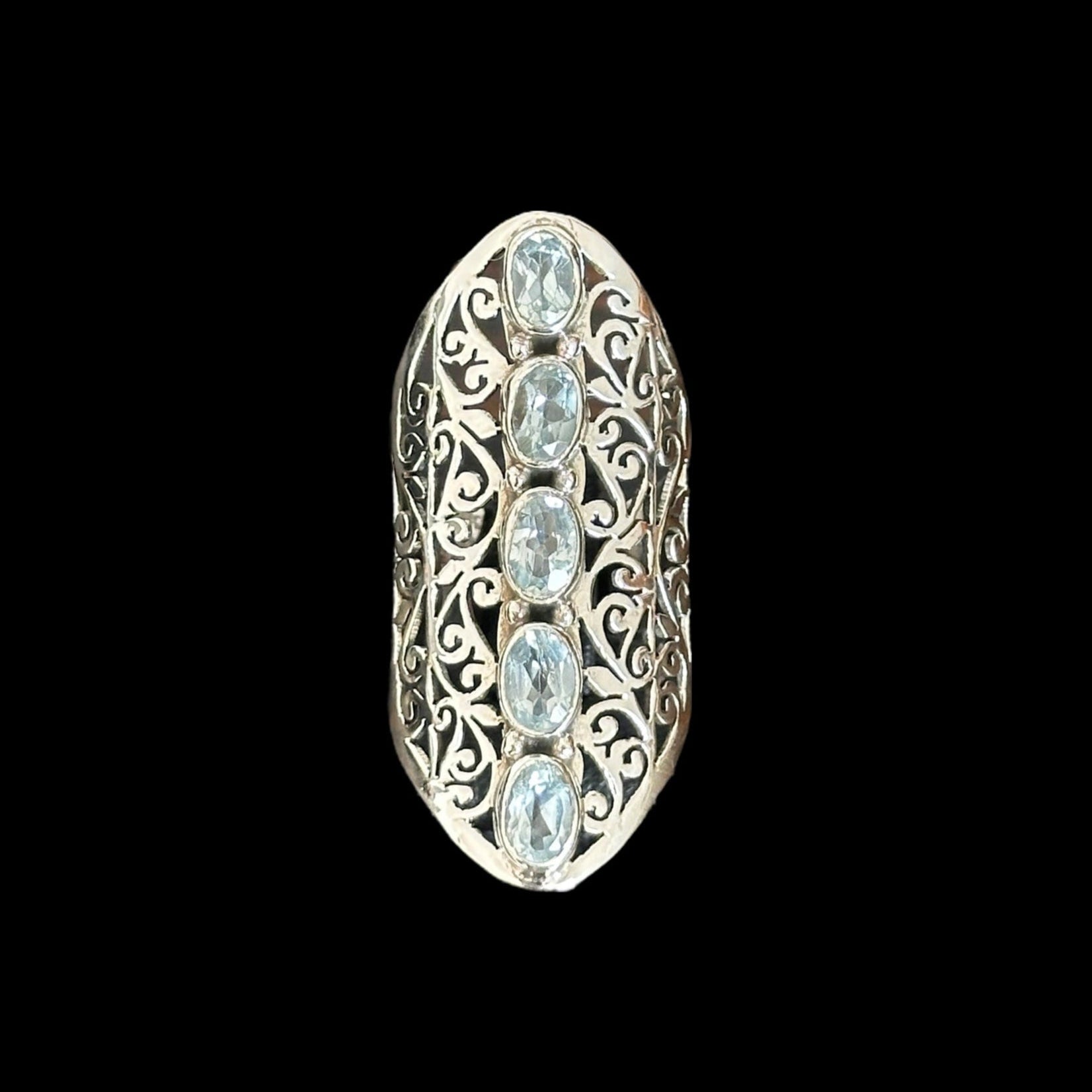 Anillo hecho a mano en plata de ley con tecnica de filigrana, con 5 Onyx Verde naturales.