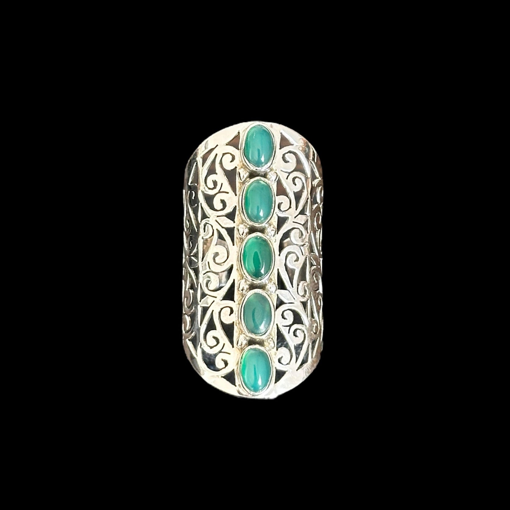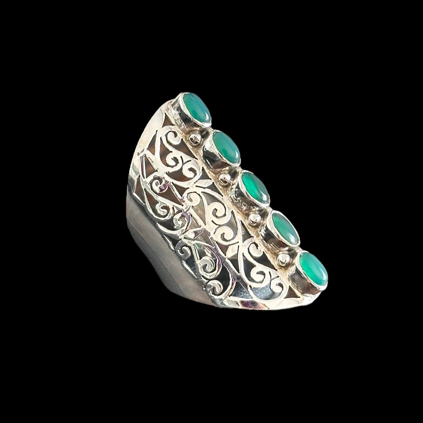Anillo hecho a mano en plata de ley con tecnica de filigrana, con 5 Onyx Verde naturales.