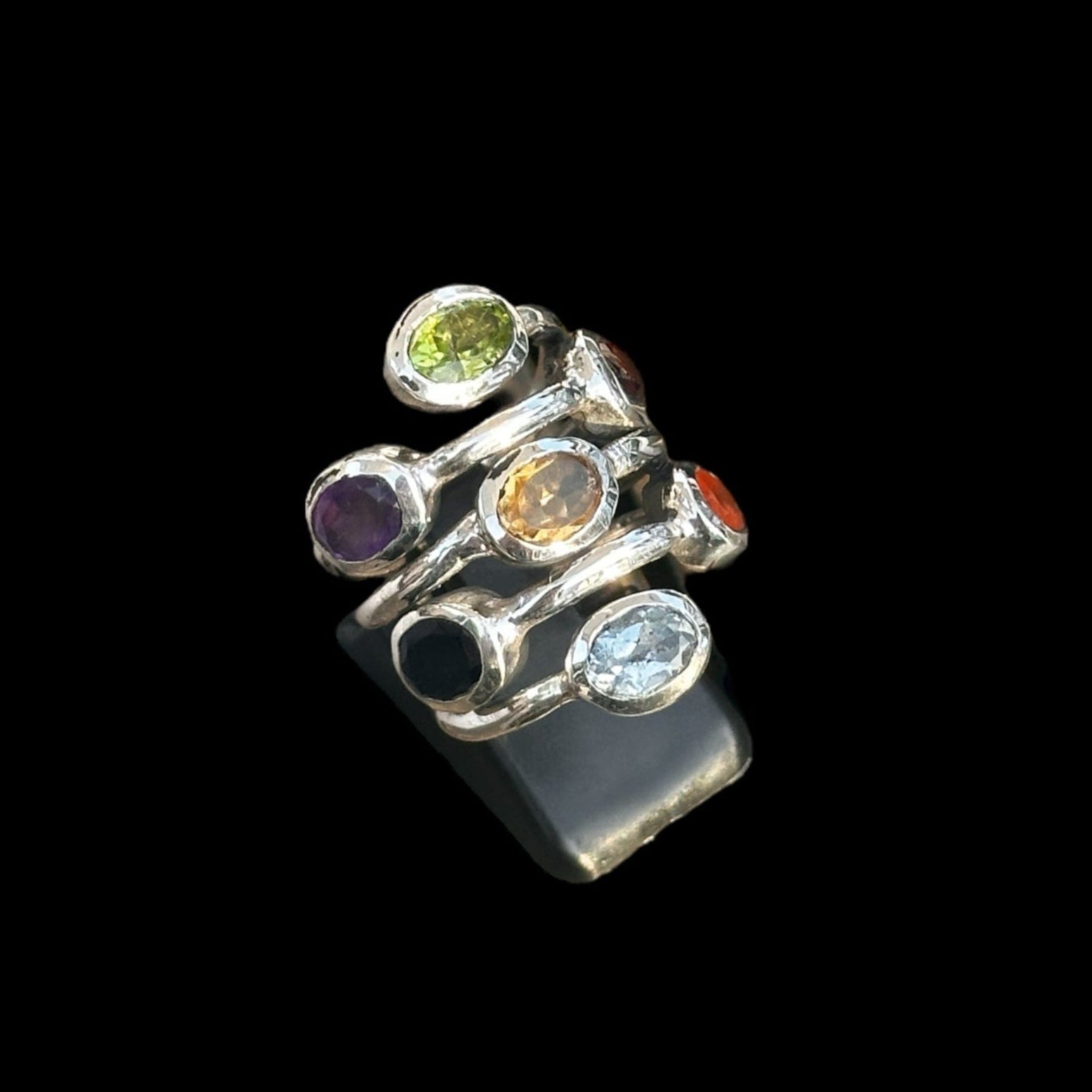Diseño artesanal en plata 925 con siete piedras naturales: granate, citrino, peridoto, amatista, topacio, ónix negro y cornalina. Un anillo vibrante, lleno de color, energía y simbolismo, ideal para quienes buscan una joya única y con significado.