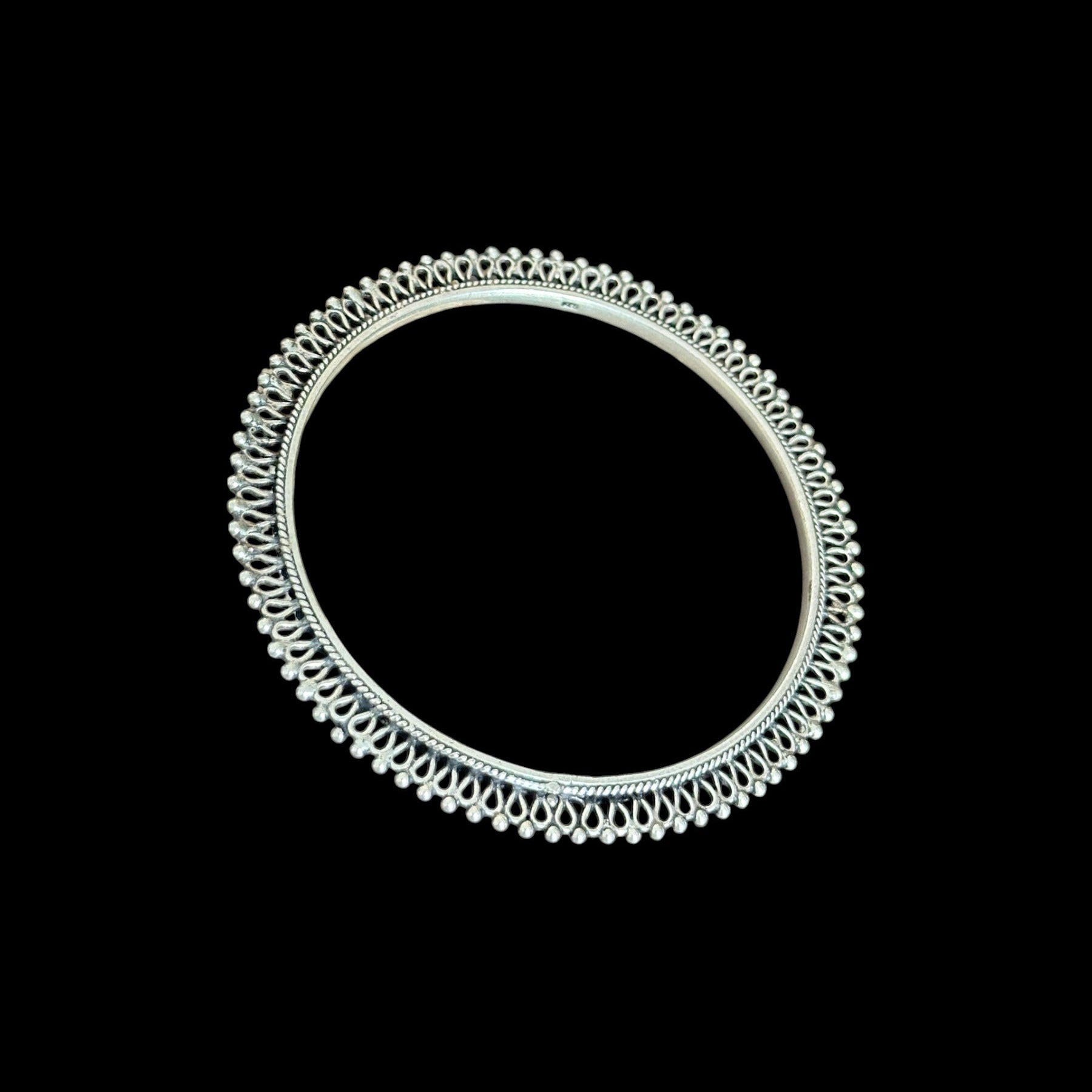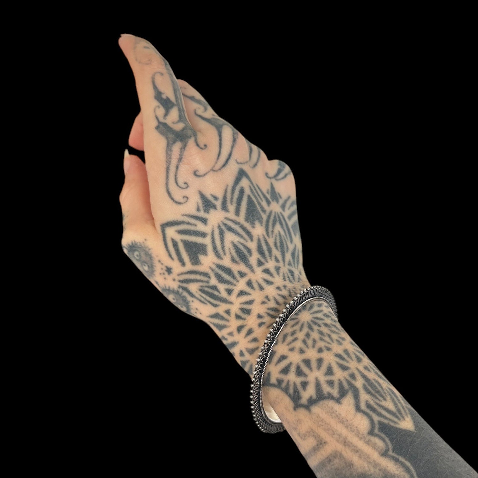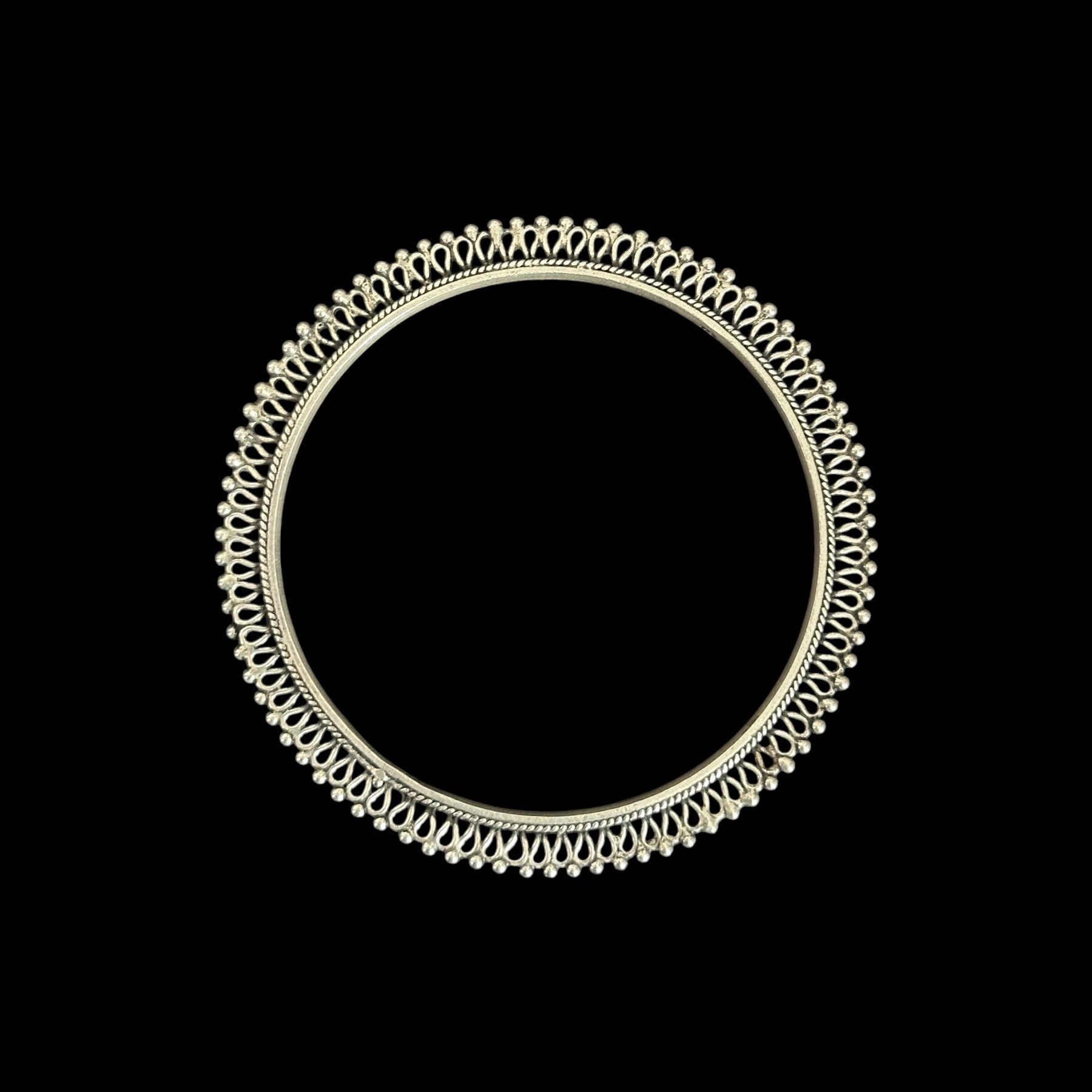 El bangle Mandira está elaborado en plata de ley 925 y presenta un diseño circular de líneas suaves y simétricas. Su estructura principal es una banda lisa y pulida que actúa como base, rodeada por un delicado trabajo entrelazado que recorre todo el contorno. El borde exterior está decorado con una sucesión de formas en gota invertida, rematadas por diminutas esferas que crean una textura rítmica y elegante. Este patrón continuo evoca los ornamentos arquitectónicos de los templos tradicionales indios, simbolizando armonía y perfección en cada detalle.
