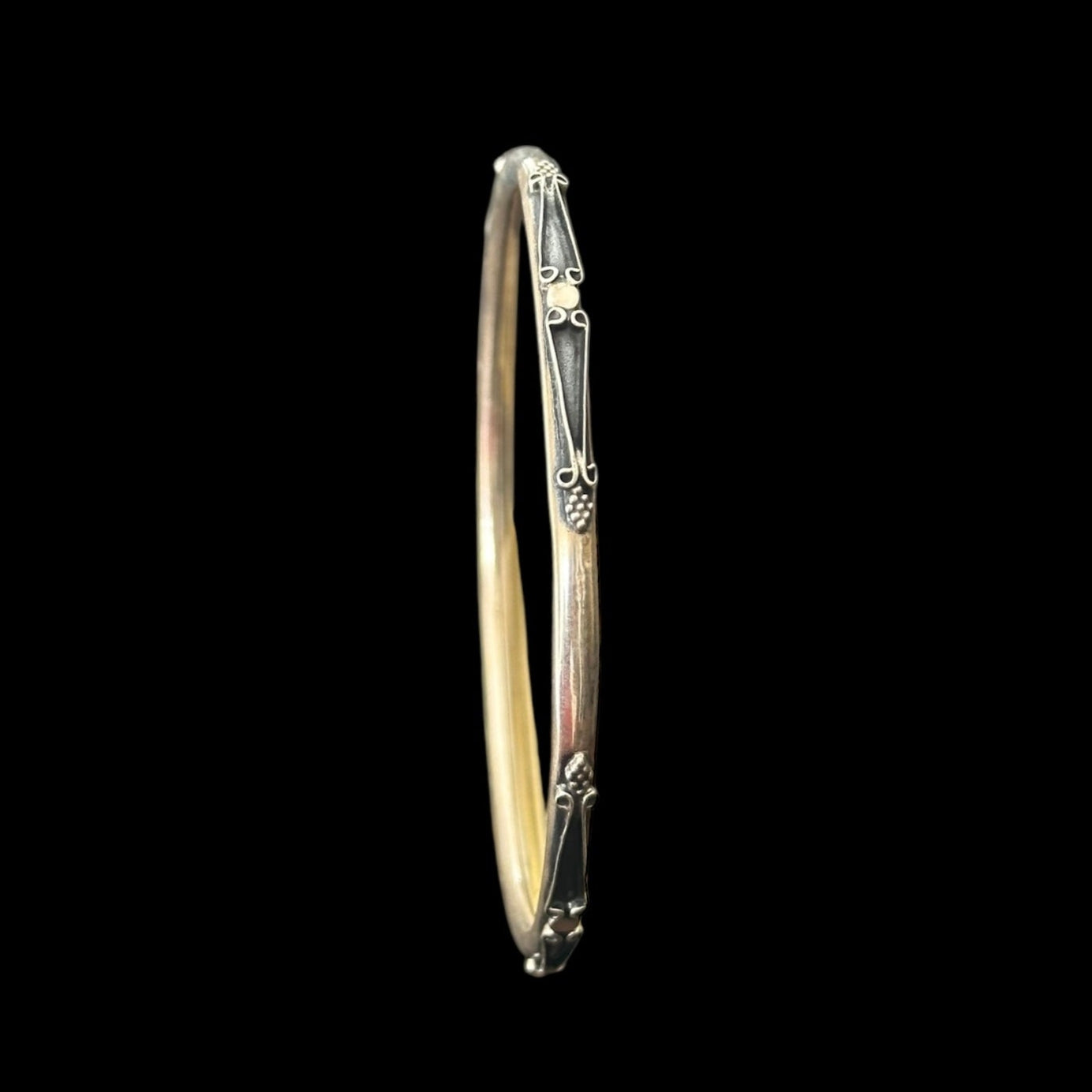 Bangle rígido elaborado en plata 925 con acabado envejecido y detalles en relieve inspirados en motivos florales tradicionales. Su diseño combina elegancia artesanal con resistencia y comodidad en el uso diario.