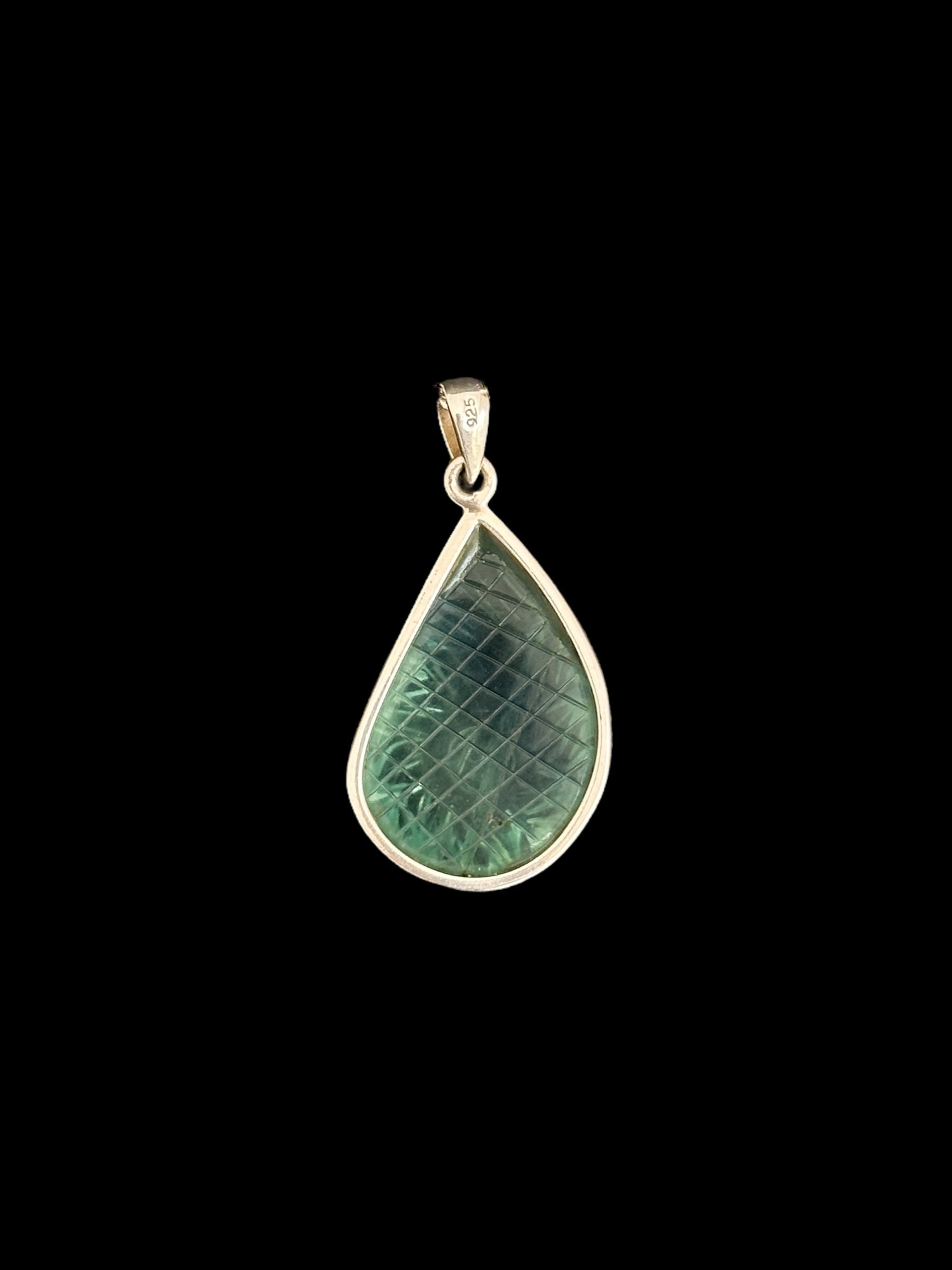 Colgante en plata de ley 925 con una Fluorita natural grabada con un diseño de flor, que resalta por sus reflejos iridiscentes y su delicado trabajo artesanal. Una pieza única que fusiona la belleza de la piedra con el arte del grabado.