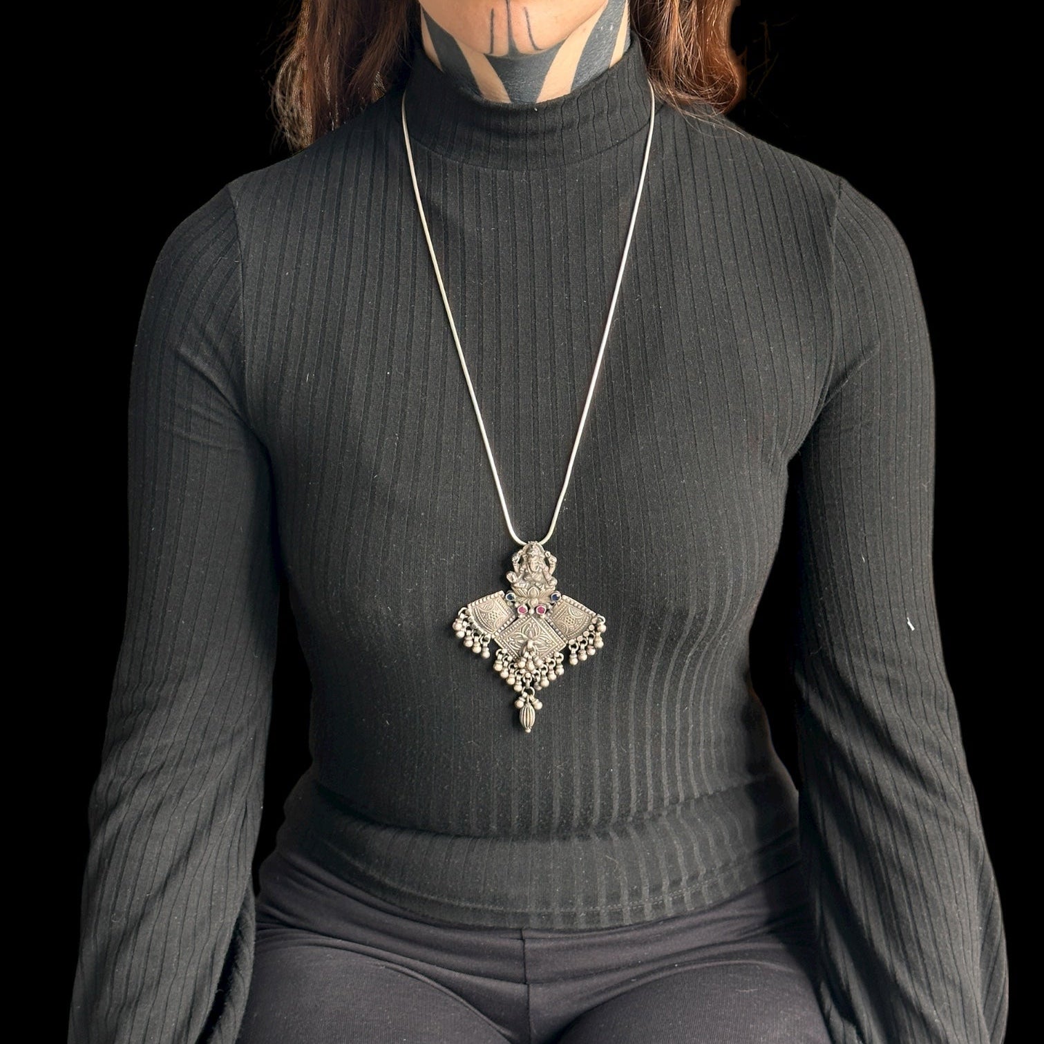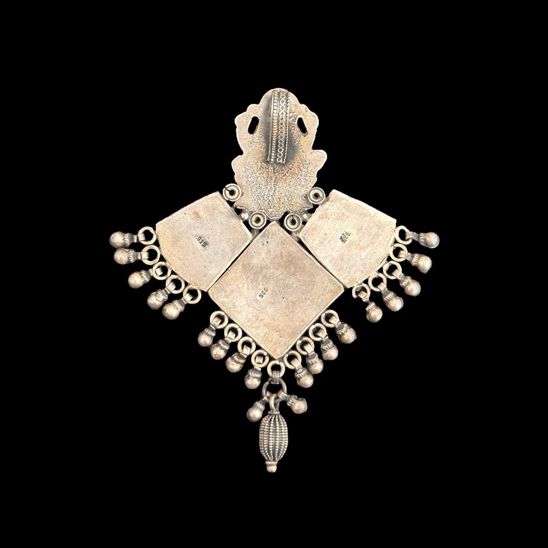 Este colgante representa al dios Ganesha, símbolo de sabiduría y prosperidad. Elaborado en plata envejecida, combina formas geométricas con grabados florales tradicionales y pequeñas cuentas colgantes. Los detalles en tonos rubí y zafiro realzan su espiritualidad y elegancia, haciendo de esta pieza un amuleto de protección y buena fortuna.