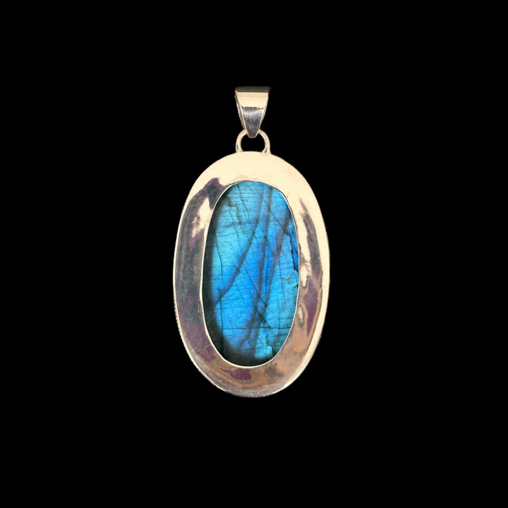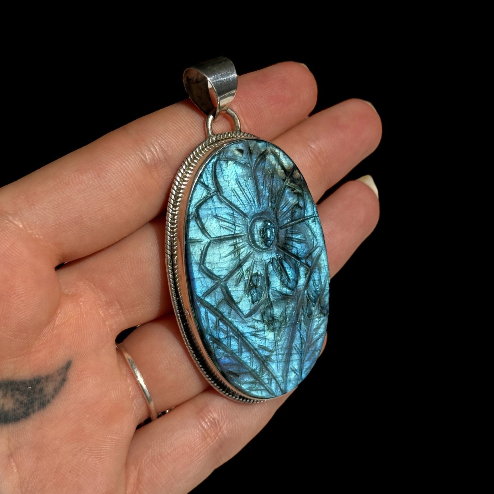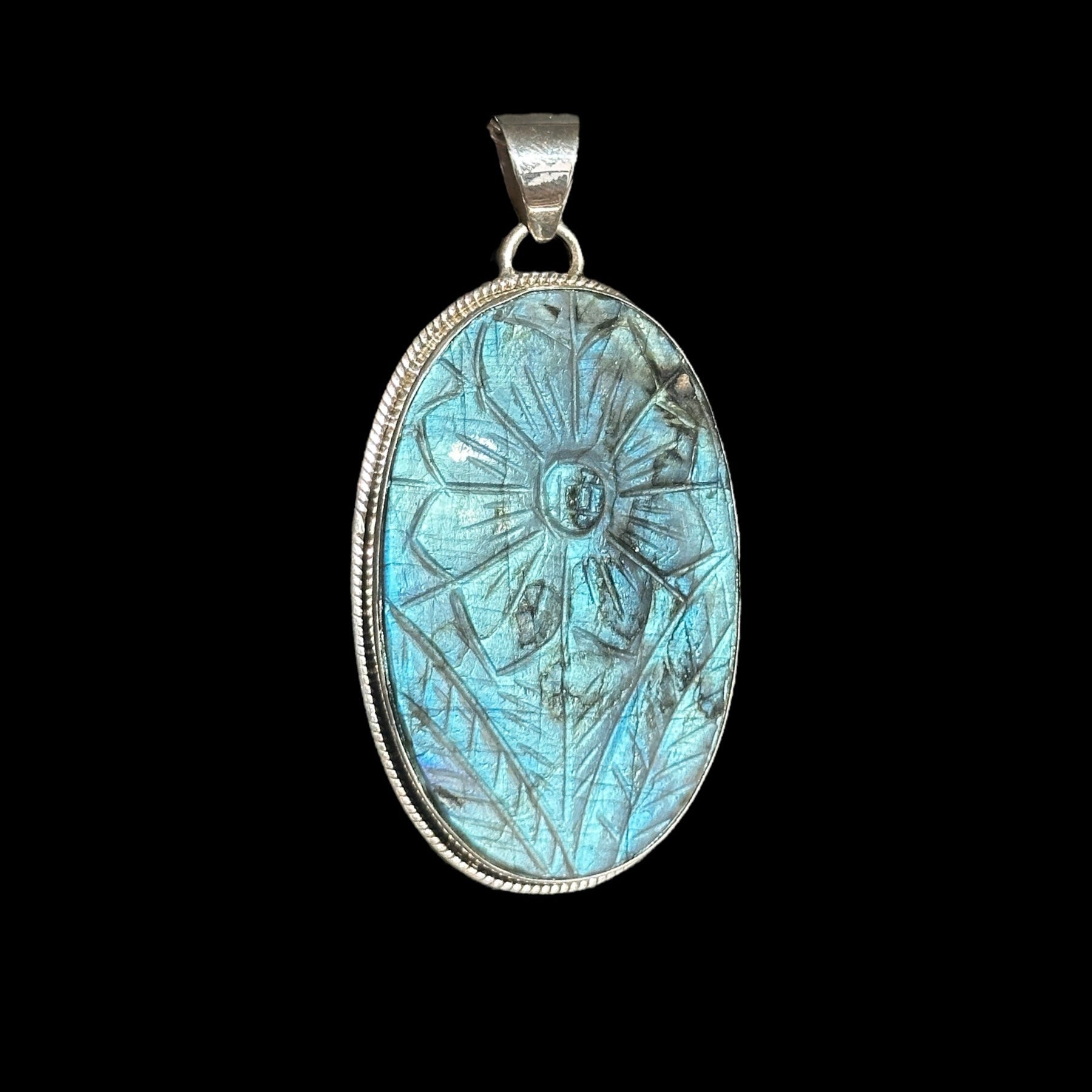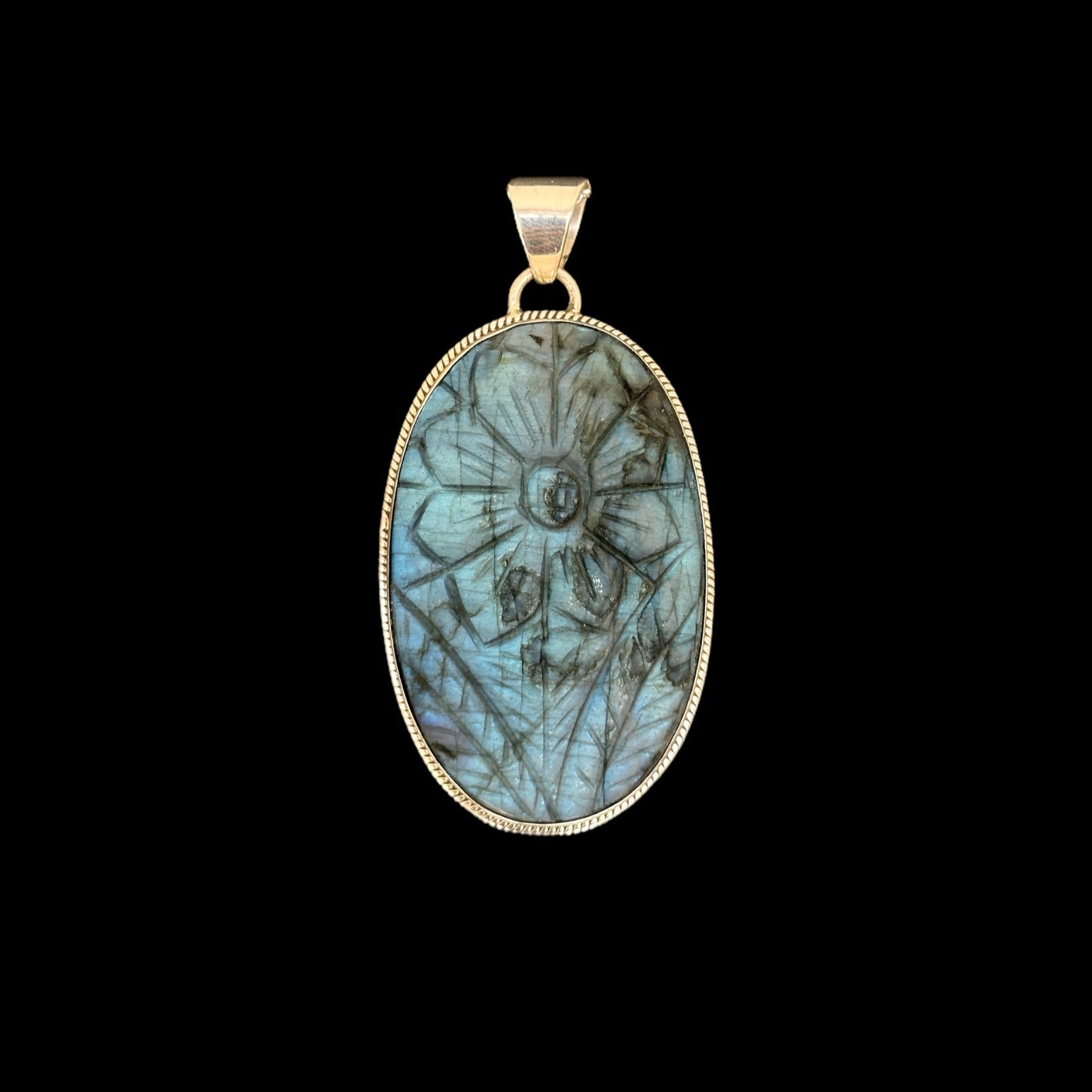 Colgante en plata de ley 925 con una labradorita natural grabada con un diseño de flor, que resalta por sus reflejos iridiscentes y su delicado trabajo artesanal. Una pieza única que fusiona la belleza de la piedra con el arte del grabado.