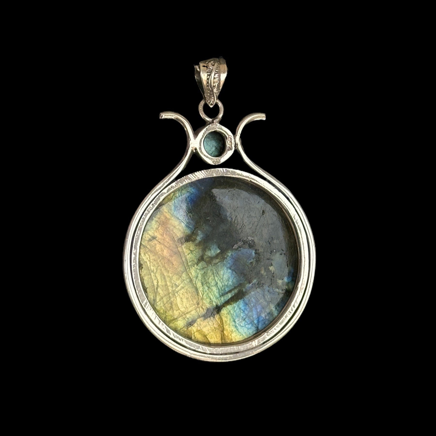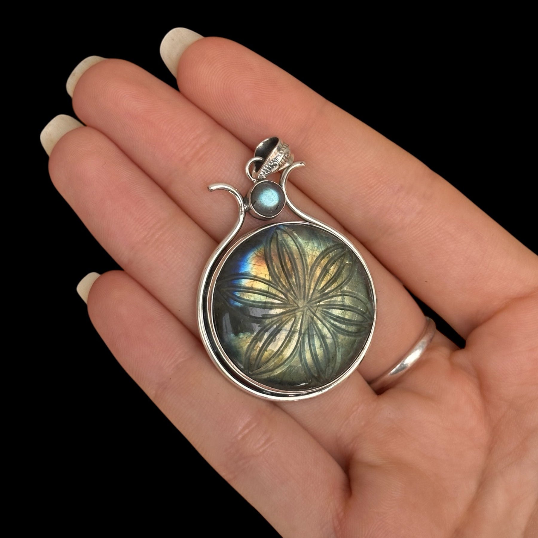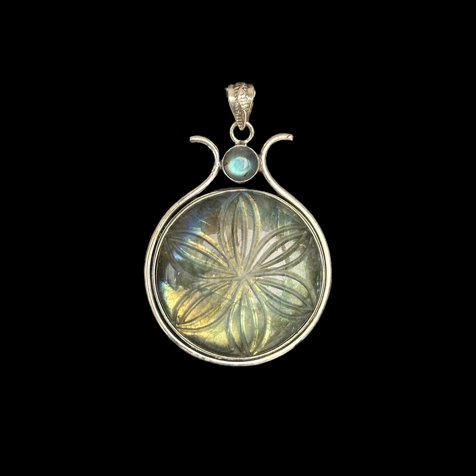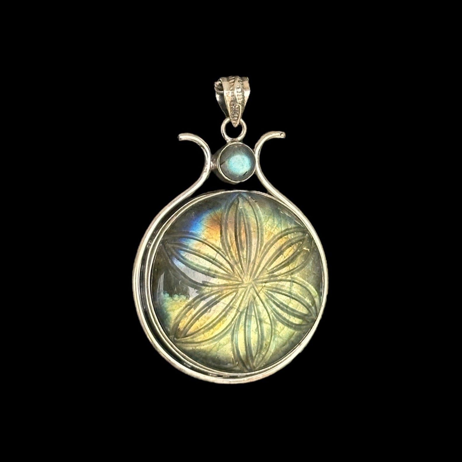 Colgante en plata de ley 925 con una labradorita natural grabada con un diseño de flor, que resalta por sus reflejos iridiscentes y su delicado trabajo artesanal. Una pieza única que fusiona la belleza de la piedra con el arte del grabado.