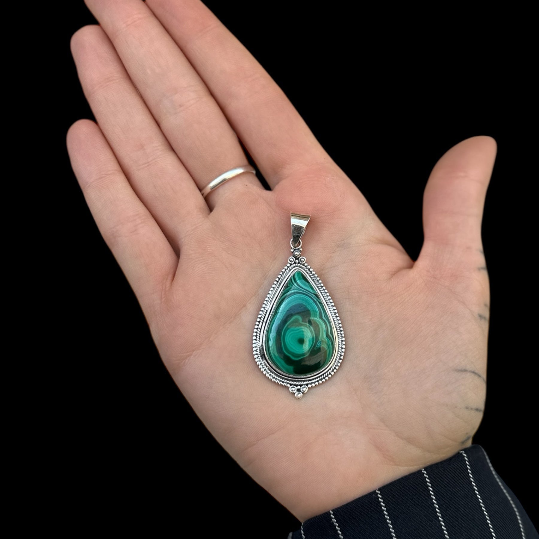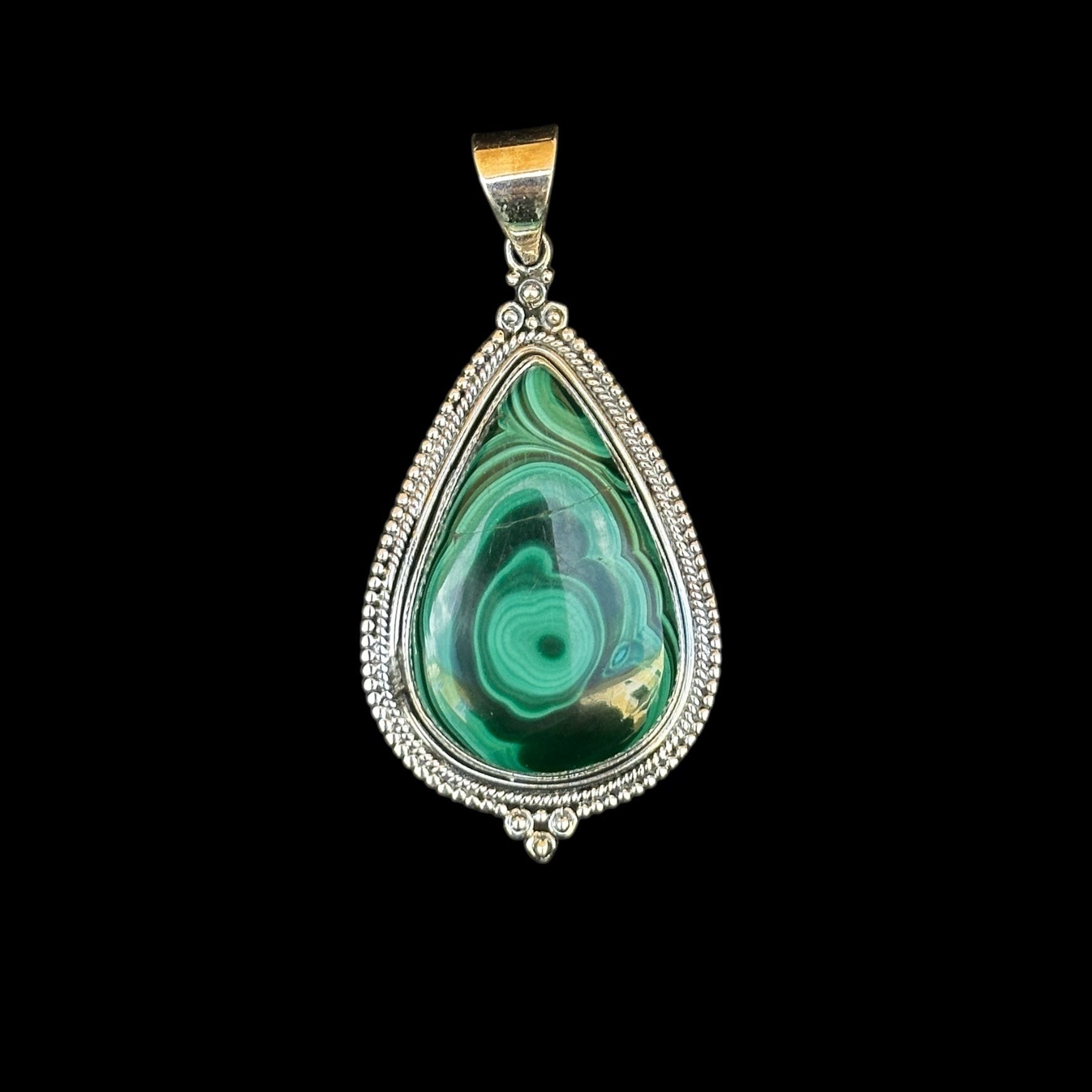 Colgante estilo etnico en plata de ley con malaquita natural.