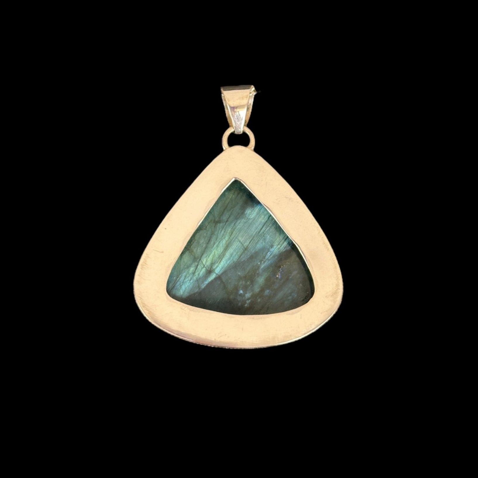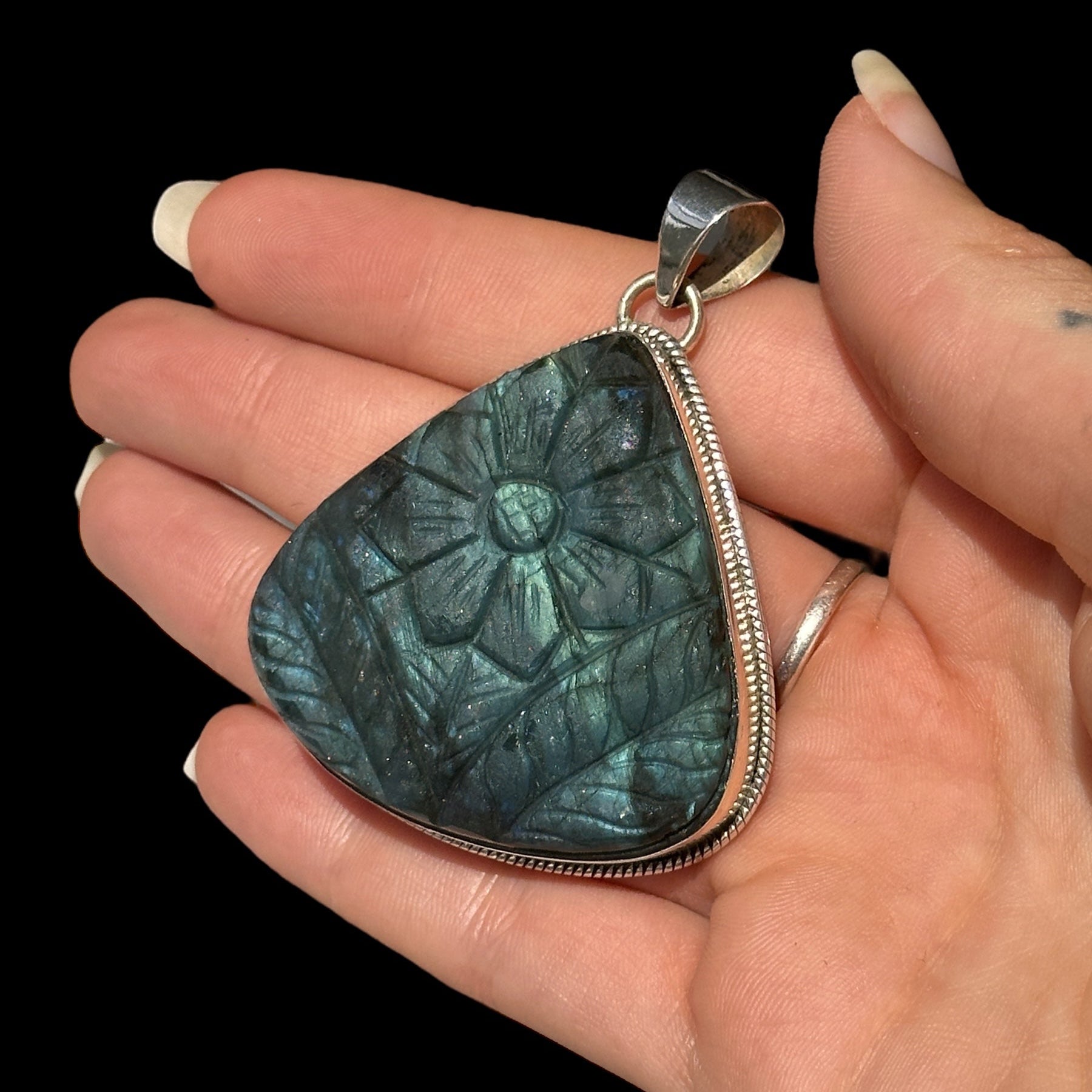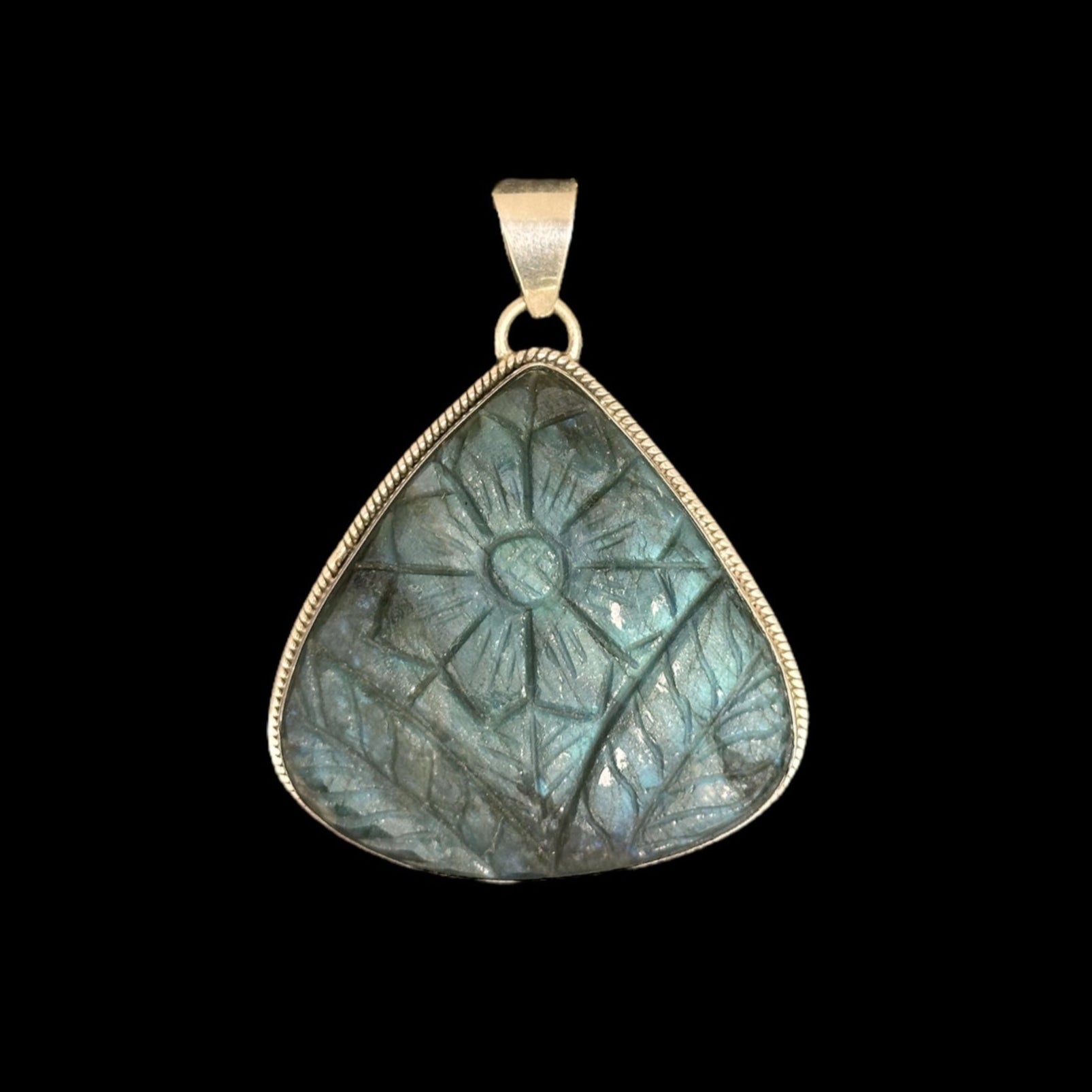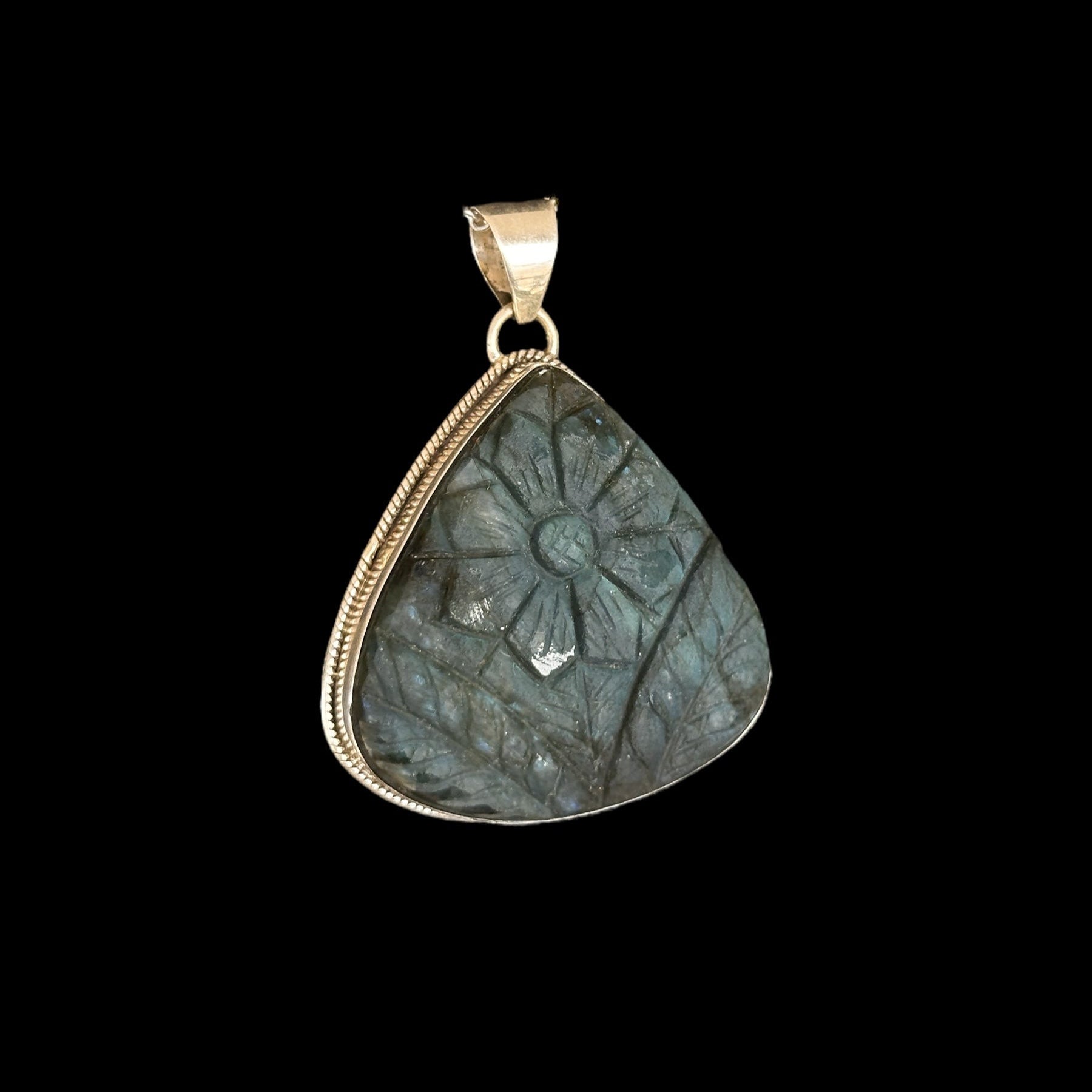 Colgante en plata de ley 925 con una labradorita natural grabada con un diseño de flor, que resalta por sus reflejos iridiscentes y su delicado trabajo artesanal. Una pieza única que fusiona la belleza de la piedra con el arte del grabado.