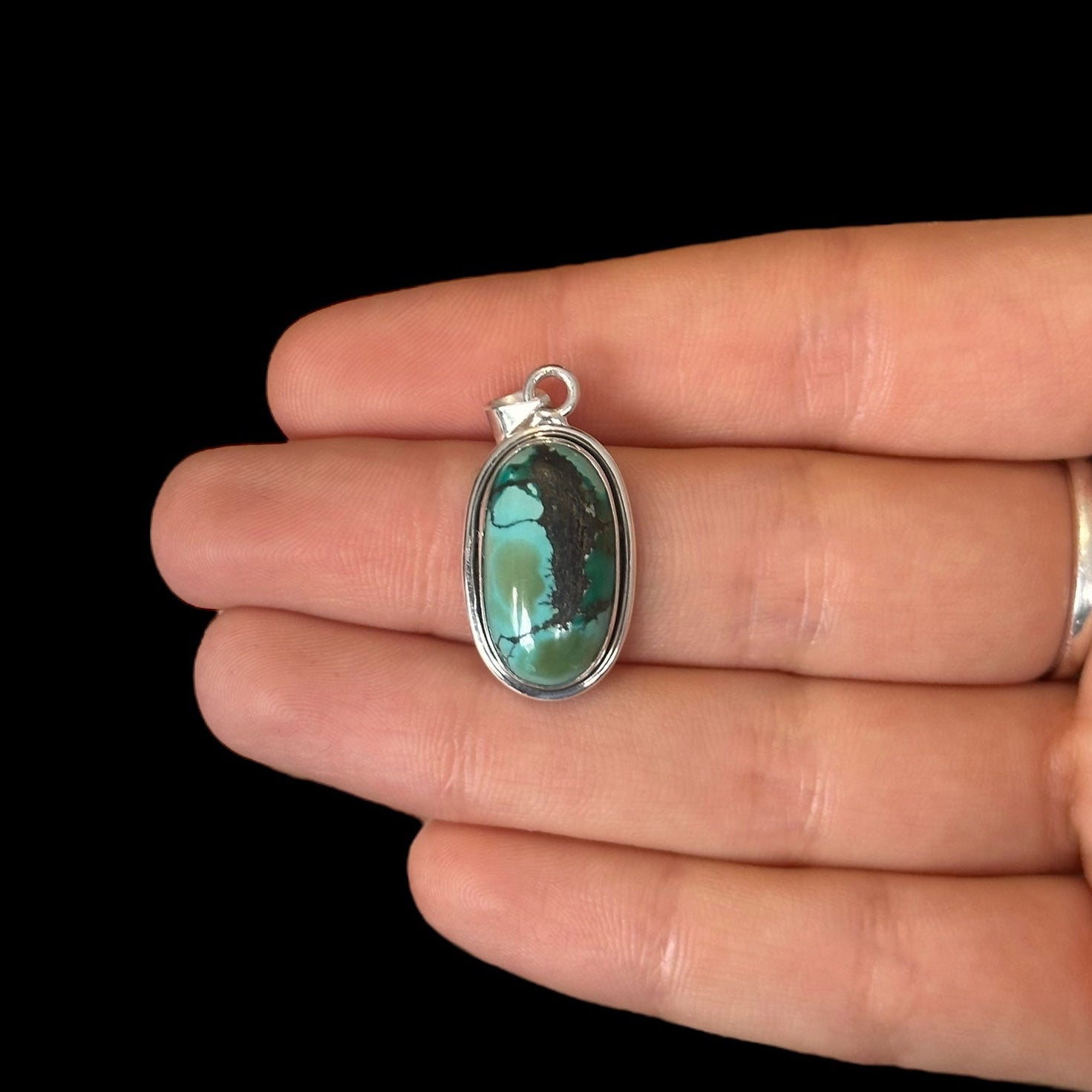 Este colgante está hecho a mano en plata de ley y engasta una turquesa natural auténtica, cuidadosamente seleccionada por su tono y energía.