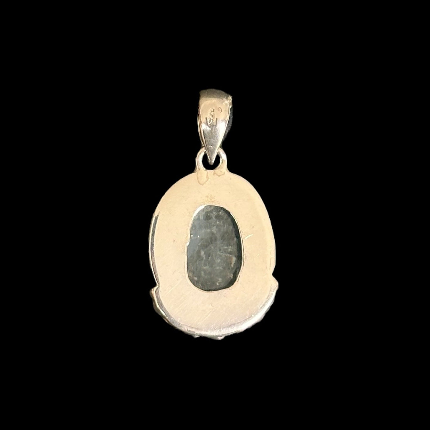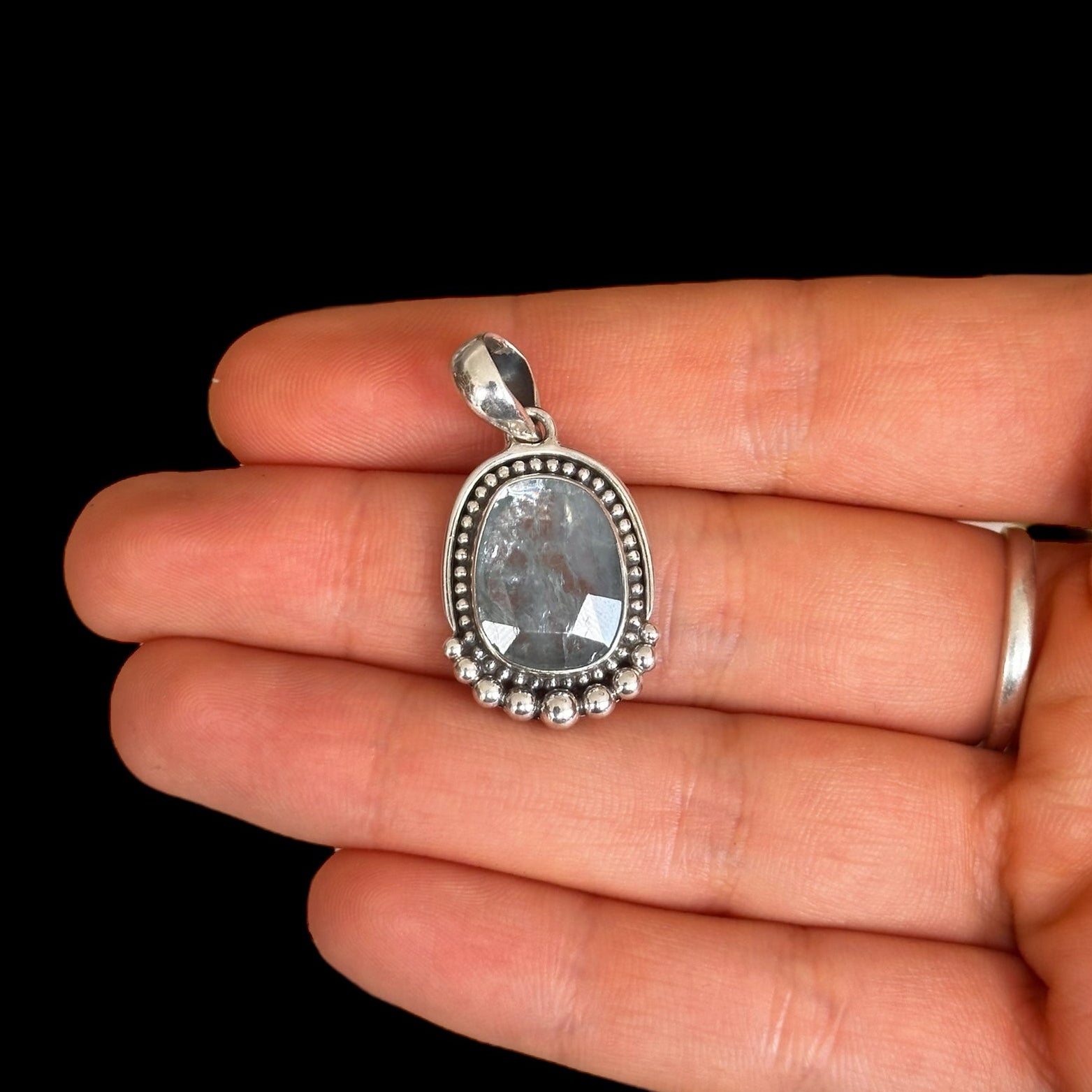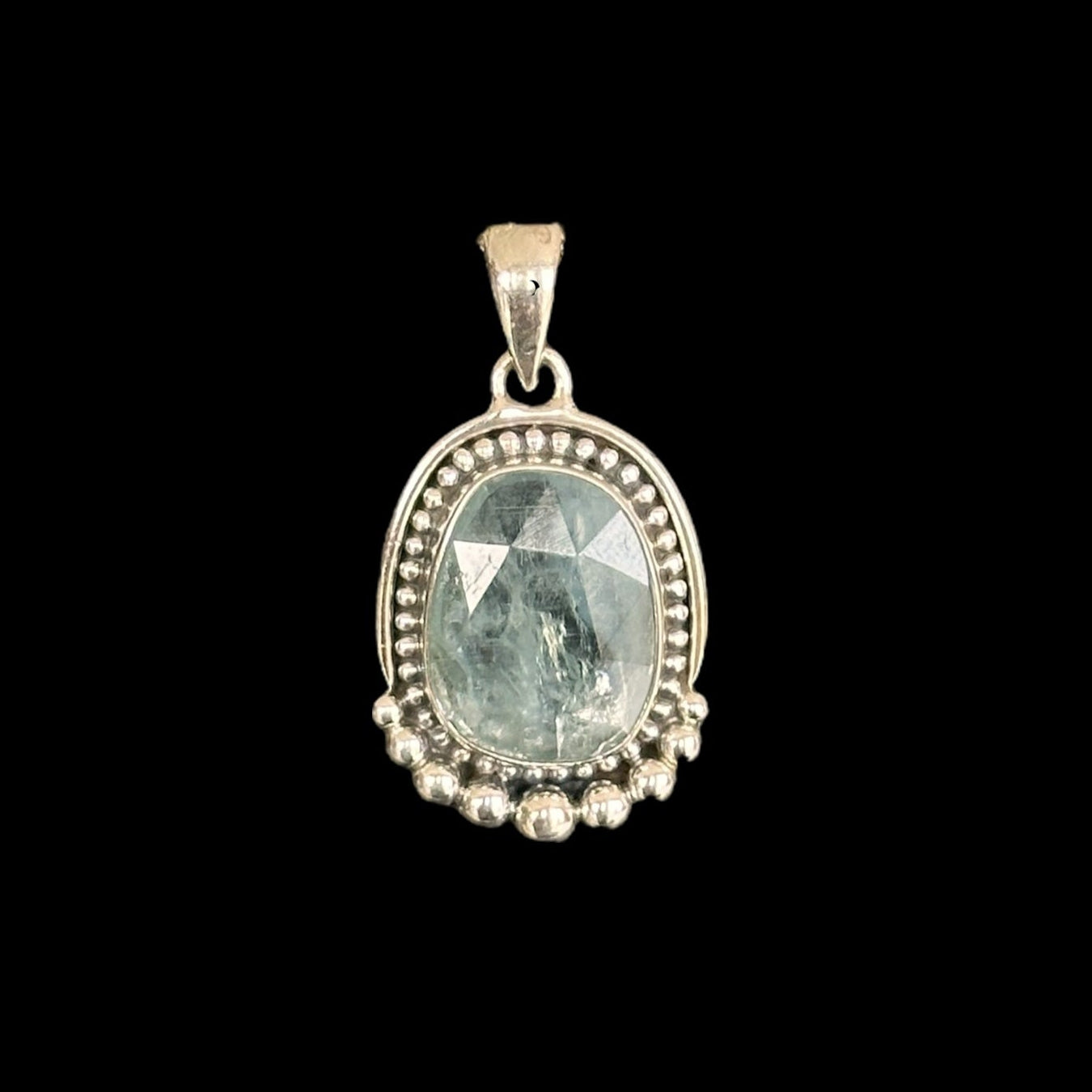 Este colgante artesanal está realizado en plata de ley 925 y engarzado con una piedra natural de aguamarina, conocida por su delicado tono azul claro que evoca la pureza del mar y la calma interior. El diseño está decorado con un borde de bolitas en plata, típico del estilo tradicional indio, que aporta elegancia y carácter a la pieza.