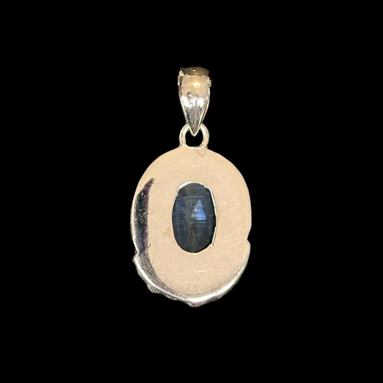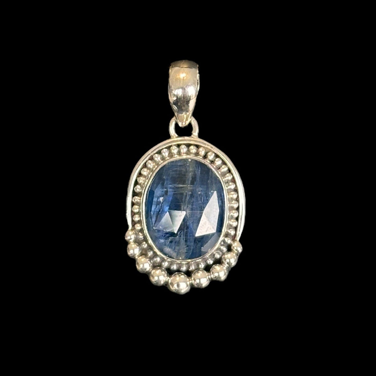 Este colgante artesanal combina la elegancia de la plata de ley 925 con la intensidad y el brillo natural de la cianita azul, una piedra conocida por sus reflejos profundos y su energía calmante. Su forma ovalada está enmarcada por delicados detalles de bolitas en plata, típicos del diseño tradicional indio, que aportan un toque étnico y atemporal.