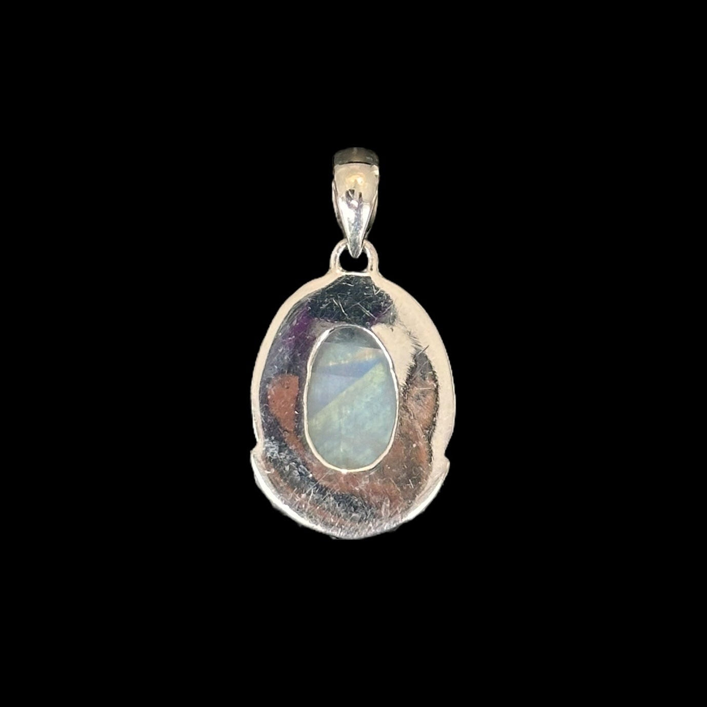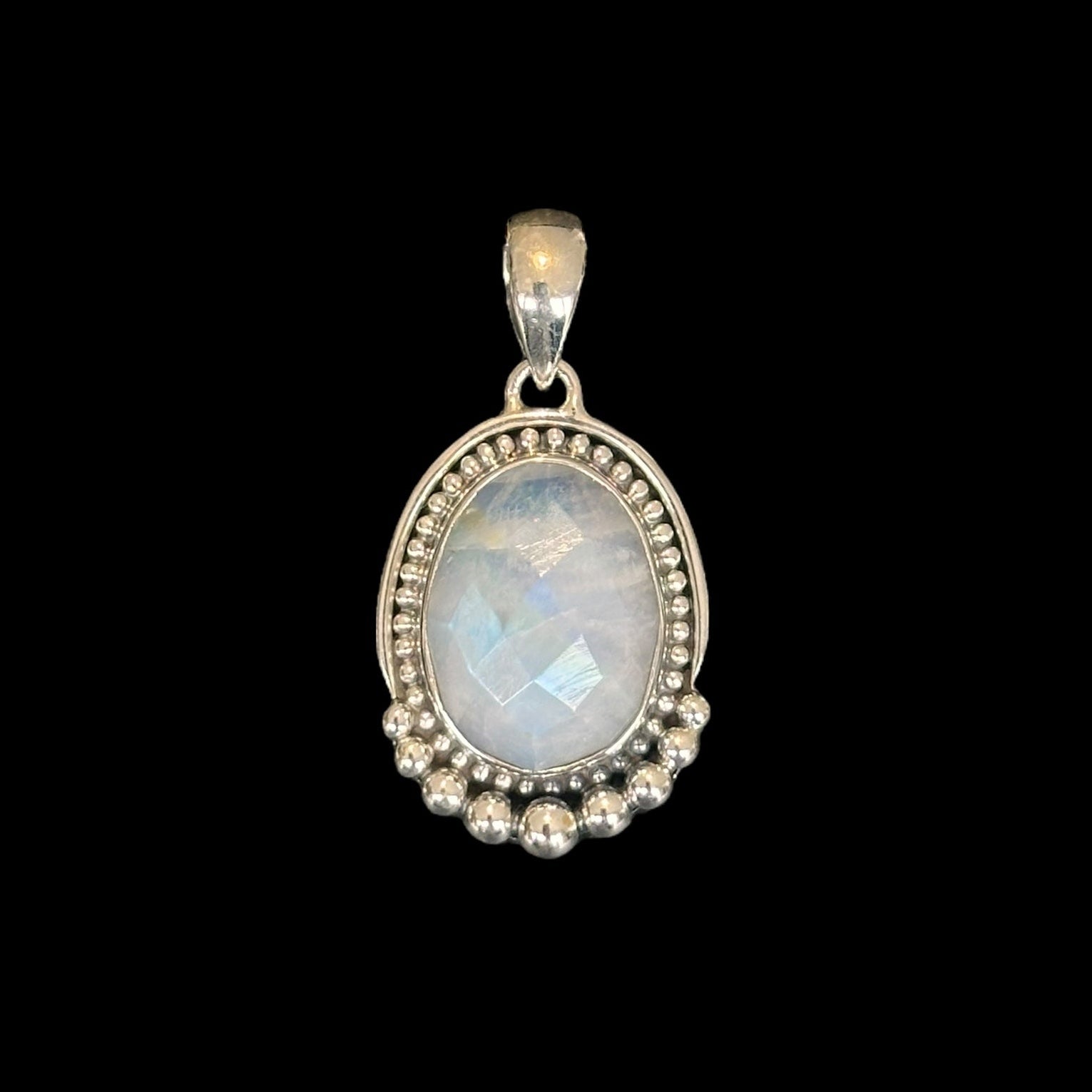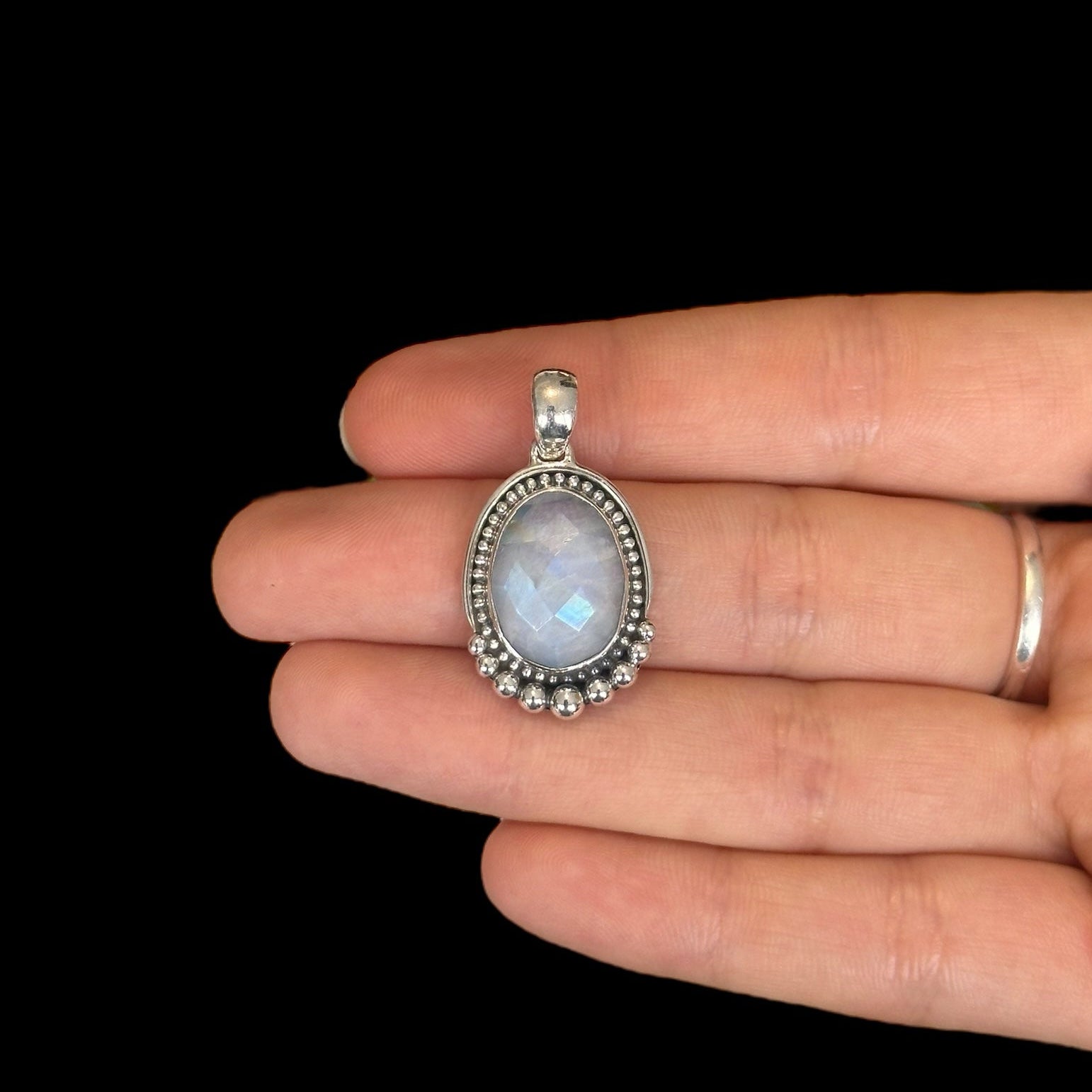 Este colgante artesanal está realizado en plata de ley 925 y engarzado con una Piedra de Luna natural, conocida por su energía femenina y por su reflejo azul. El diseño está decorado con un borde de bolitas en plata, típico del estilo tradicional indio, que aporta elegancia y carácter a la pieza.