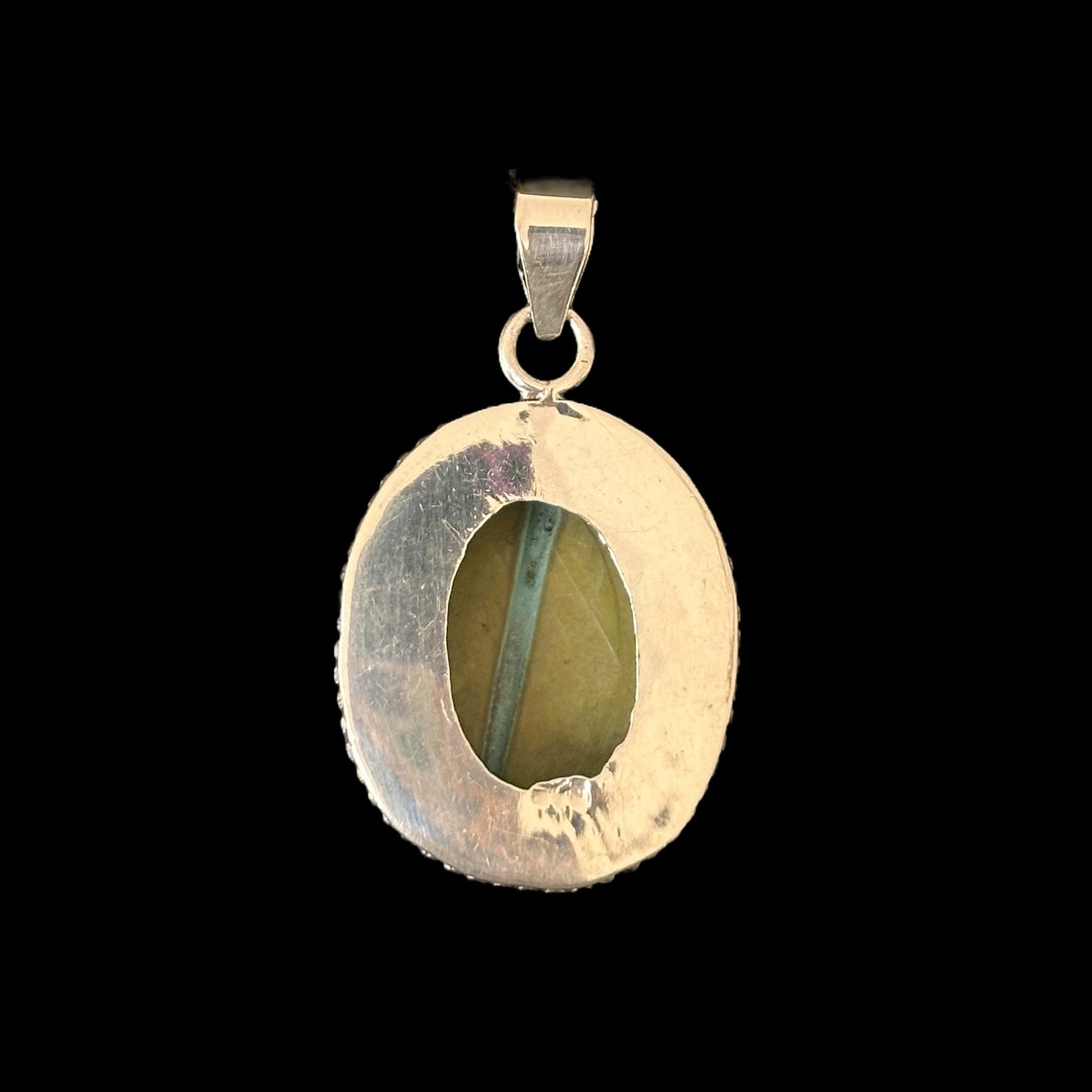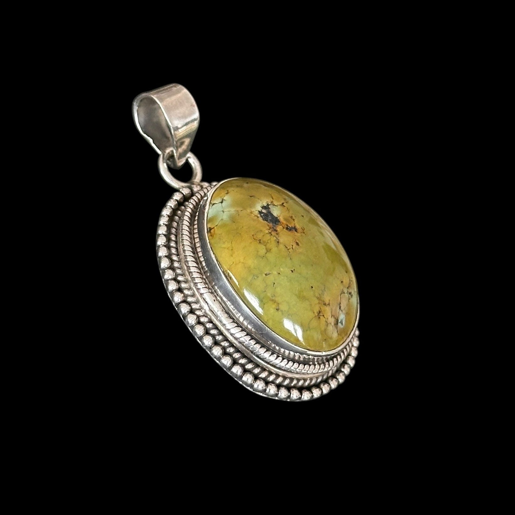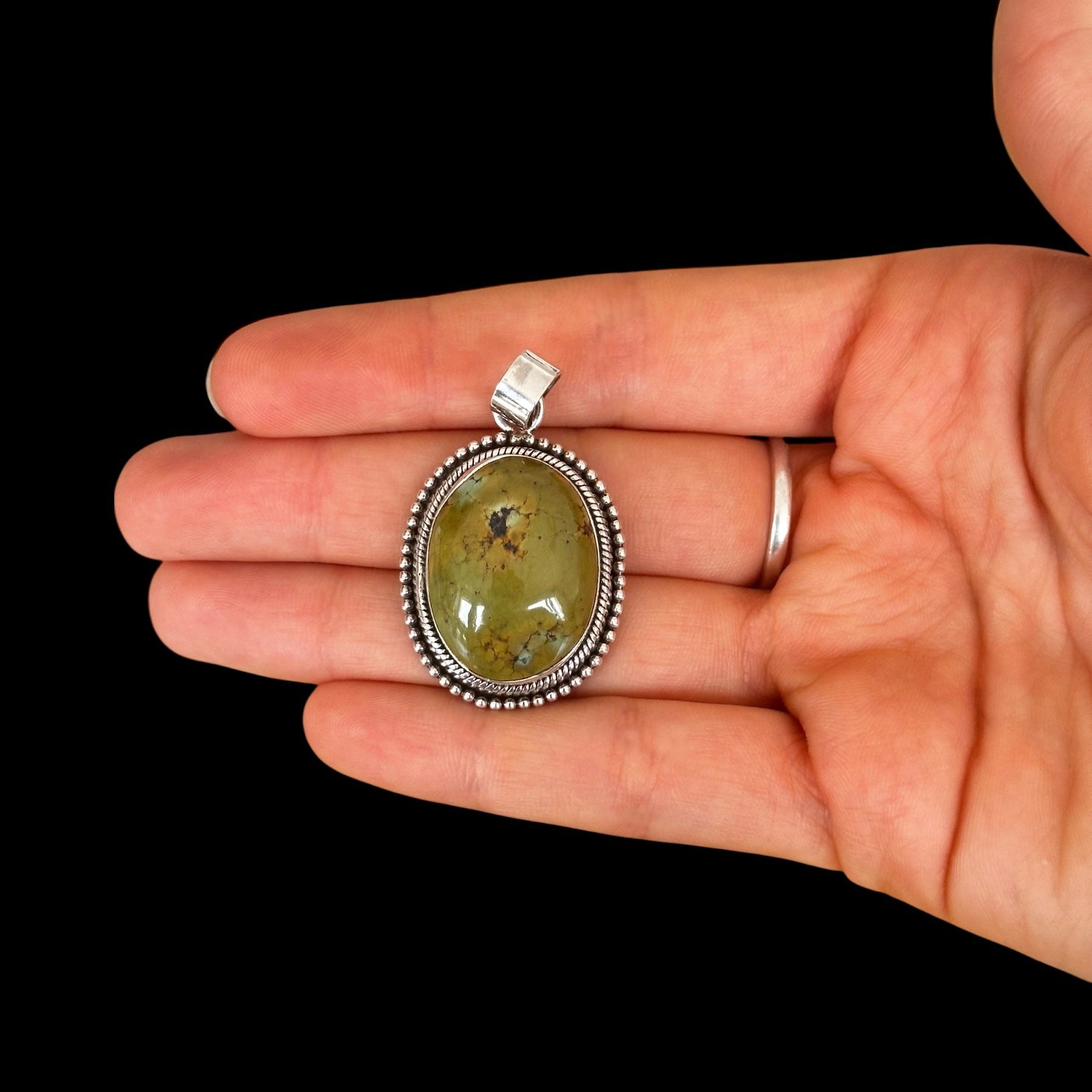 Este colgante está elaborado a mano en plata de ley 925 y engarza una turquesa natural de tonos verde-azulados con vetas marrones únicas, que evocan la tierra y la energía del desierto. Cada piedra es diferente, lo que convierte a cada pieza en una joya exclusiva e irrepetible.