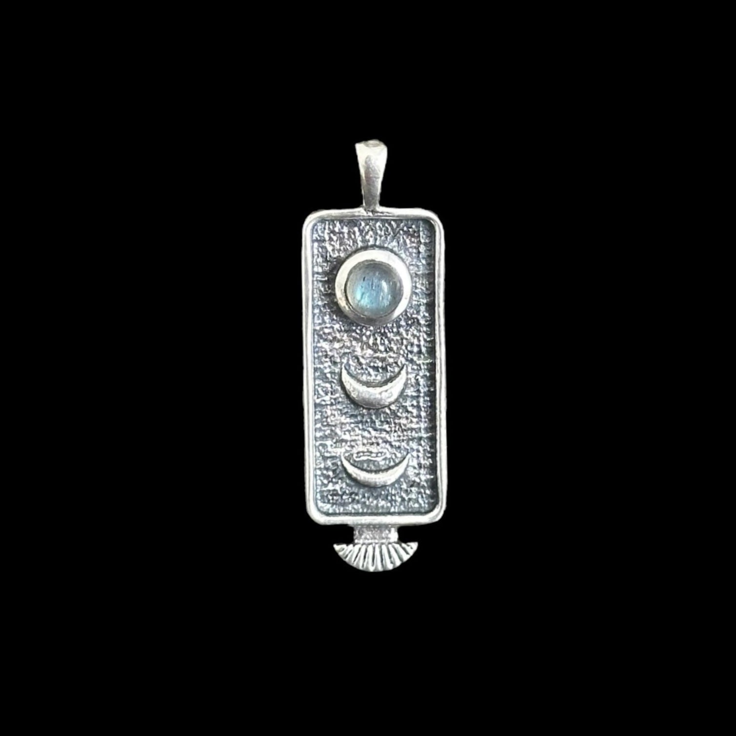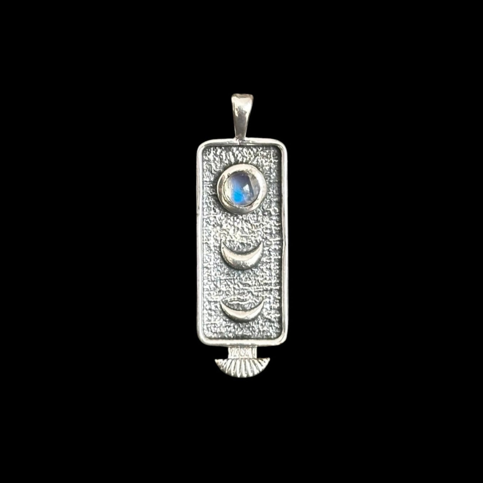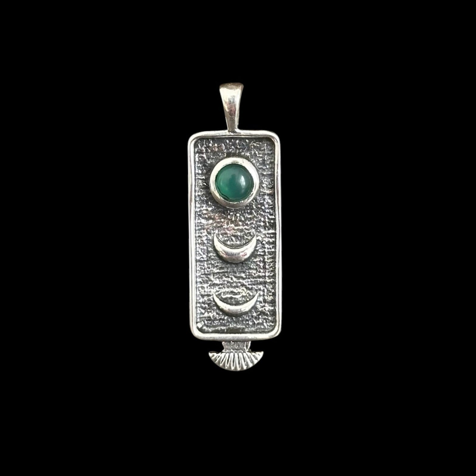Este colgante está elaborado en plata con un diseño místico y único. En la parte superior luce una piedra natural. En el centro, dos medias lunas grabadas simbolizan los ciclos de la vida y la conexión con la energía femenina, mientras que en la base un detalle en forma de sol equilibra el diseño.