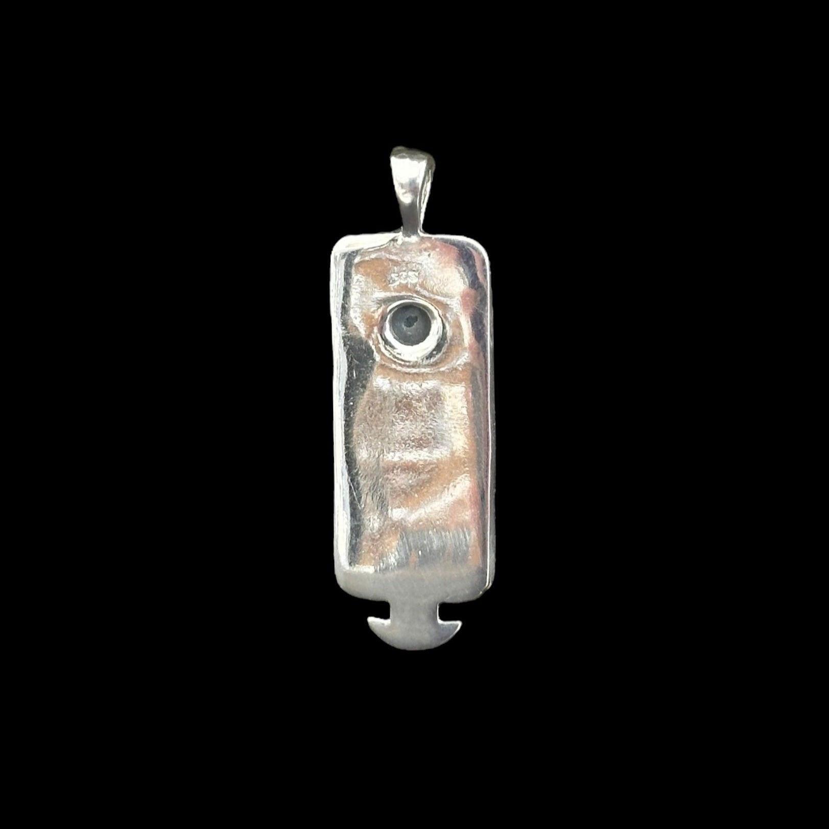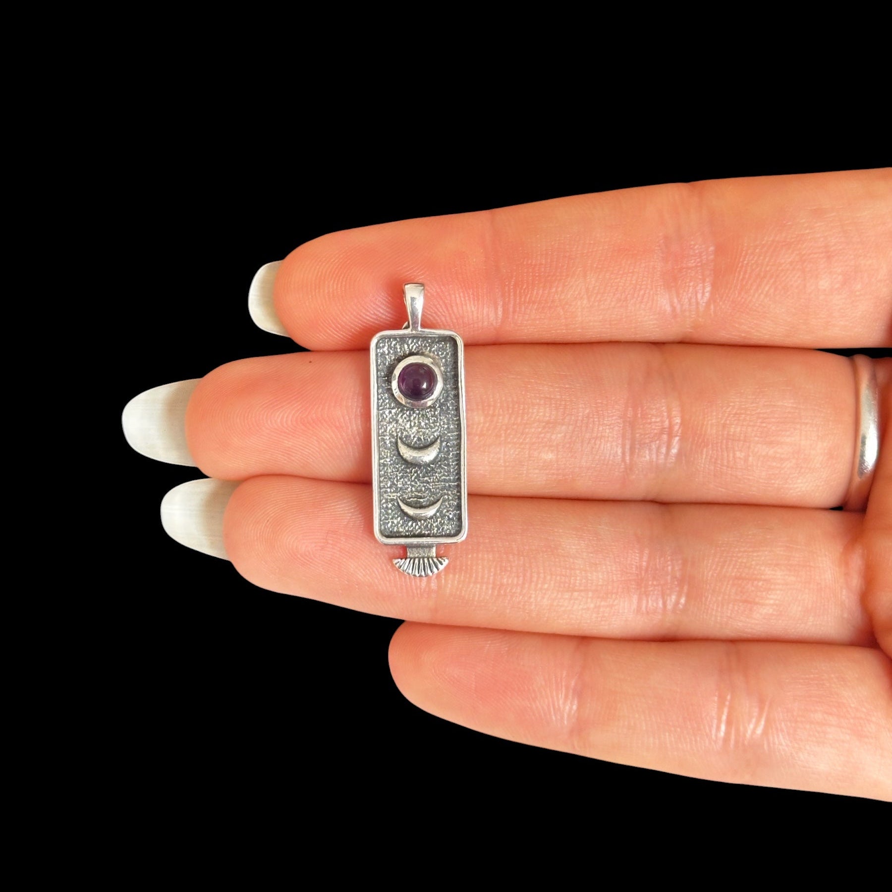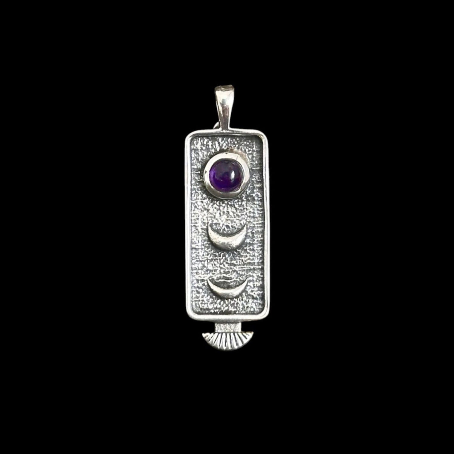 Este colgante está elaborado en plata con un diseño místico y único. En la parte superior luce una piedra natural. En el centro, dos medias lunas grabadas simbolizan los ciclos de la vida y la conexión con la energía femenina, mientras que en la base un detalle en forma de sol equilibra el diseño.