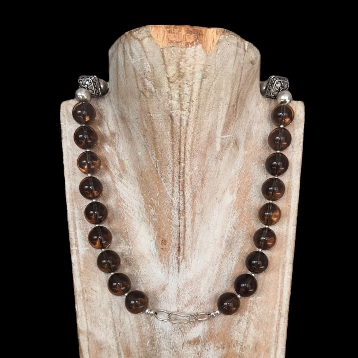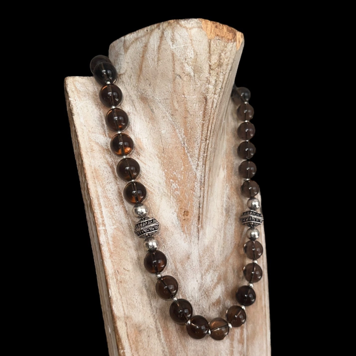 Este elegante collar está compuesto por cuentas esféricas de cuarzo ahumado natural de 1,2 cm de diámetro, cuidadosamente pulidas para resaltar su brillo y transparencia característica en tonos marrón oscuro y ámbar. Las cuentas, uniformes en tamaño y forma, están ensartadas de manera precisa para garantizar una disposición equilibrada y armónica.