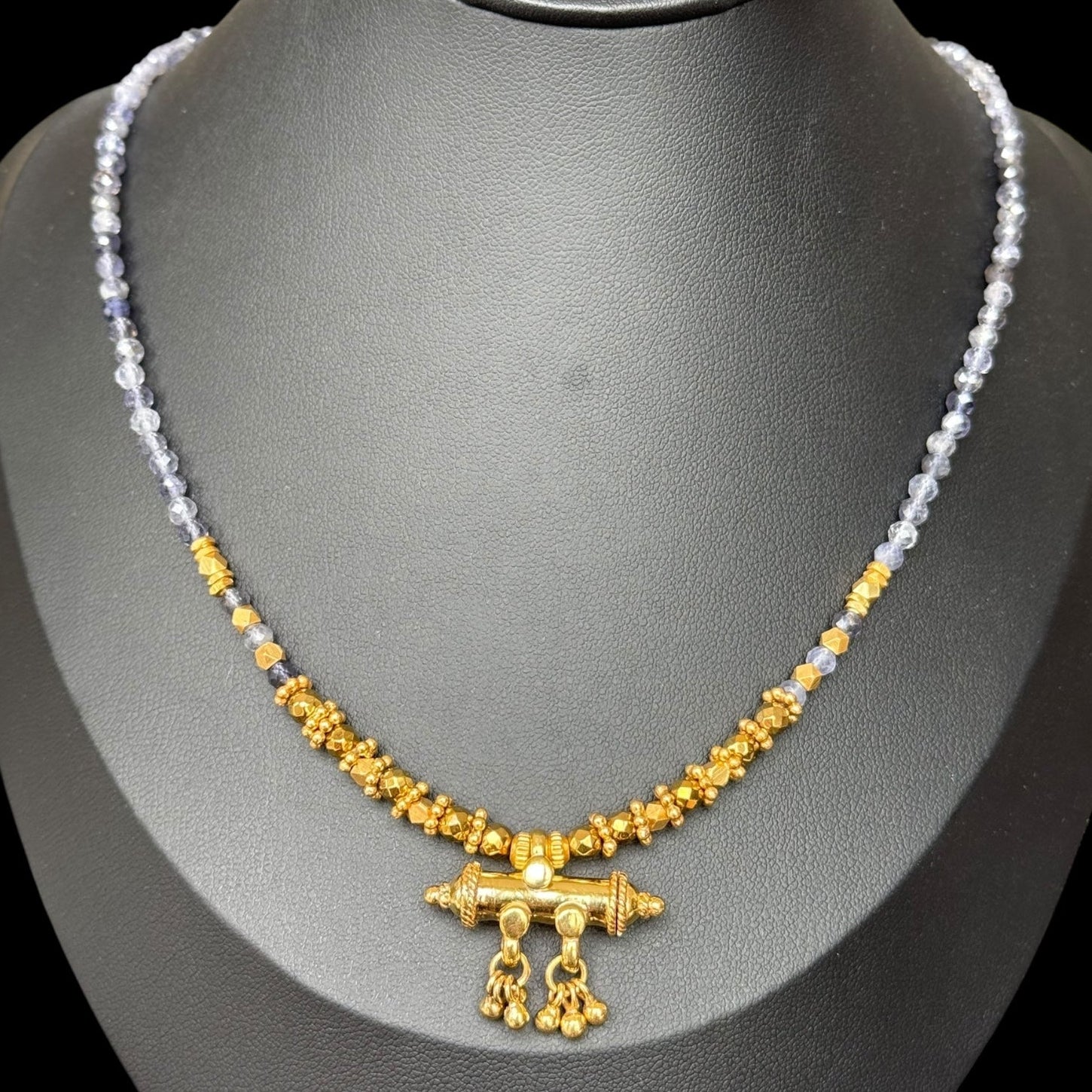 Sutil y sofisticado. Las cuentas de iolita natural aportan un tono azul violáceo muy especial, mientras que el colgante mantra box de latón, sin piedra, añade un toque espiritual y artesanal.