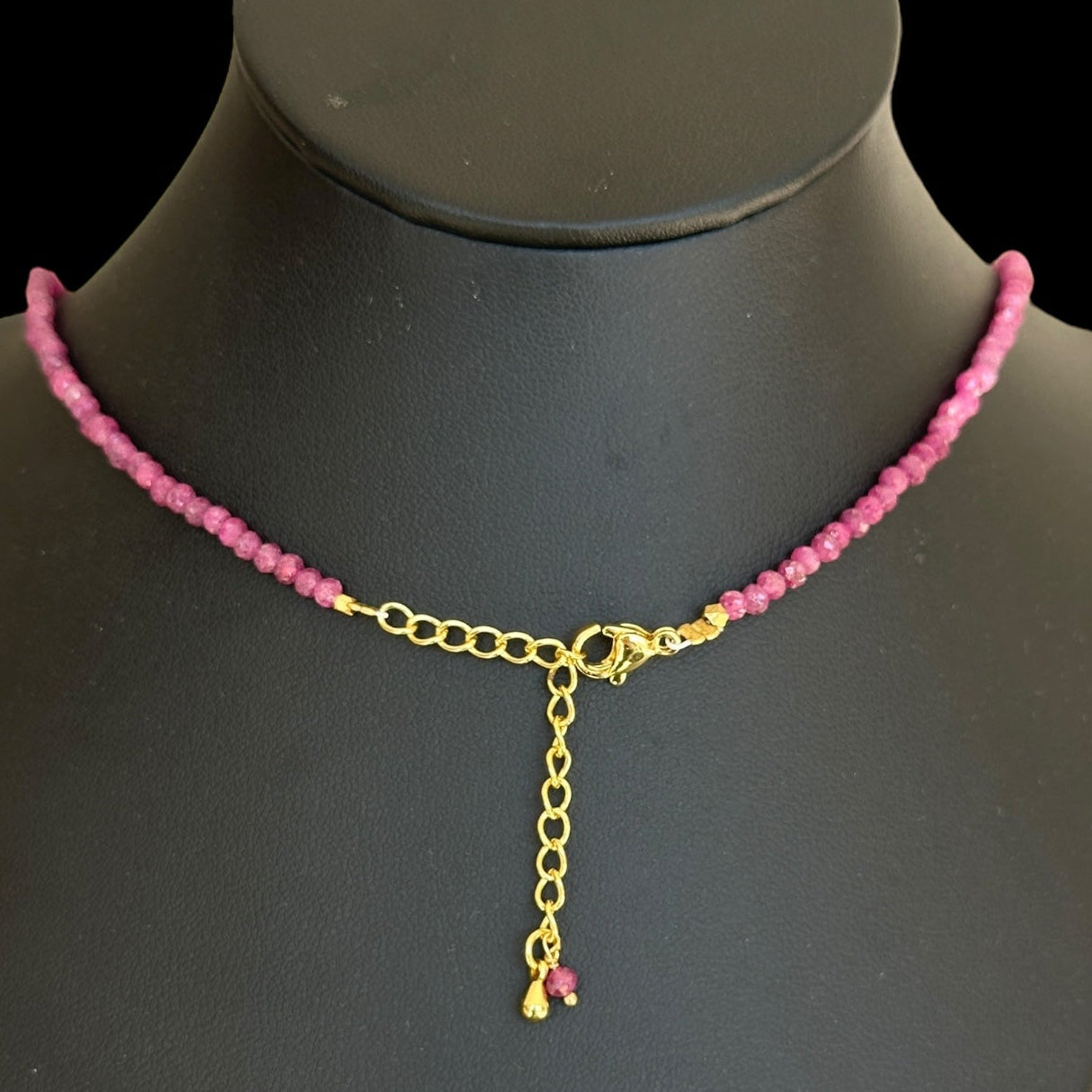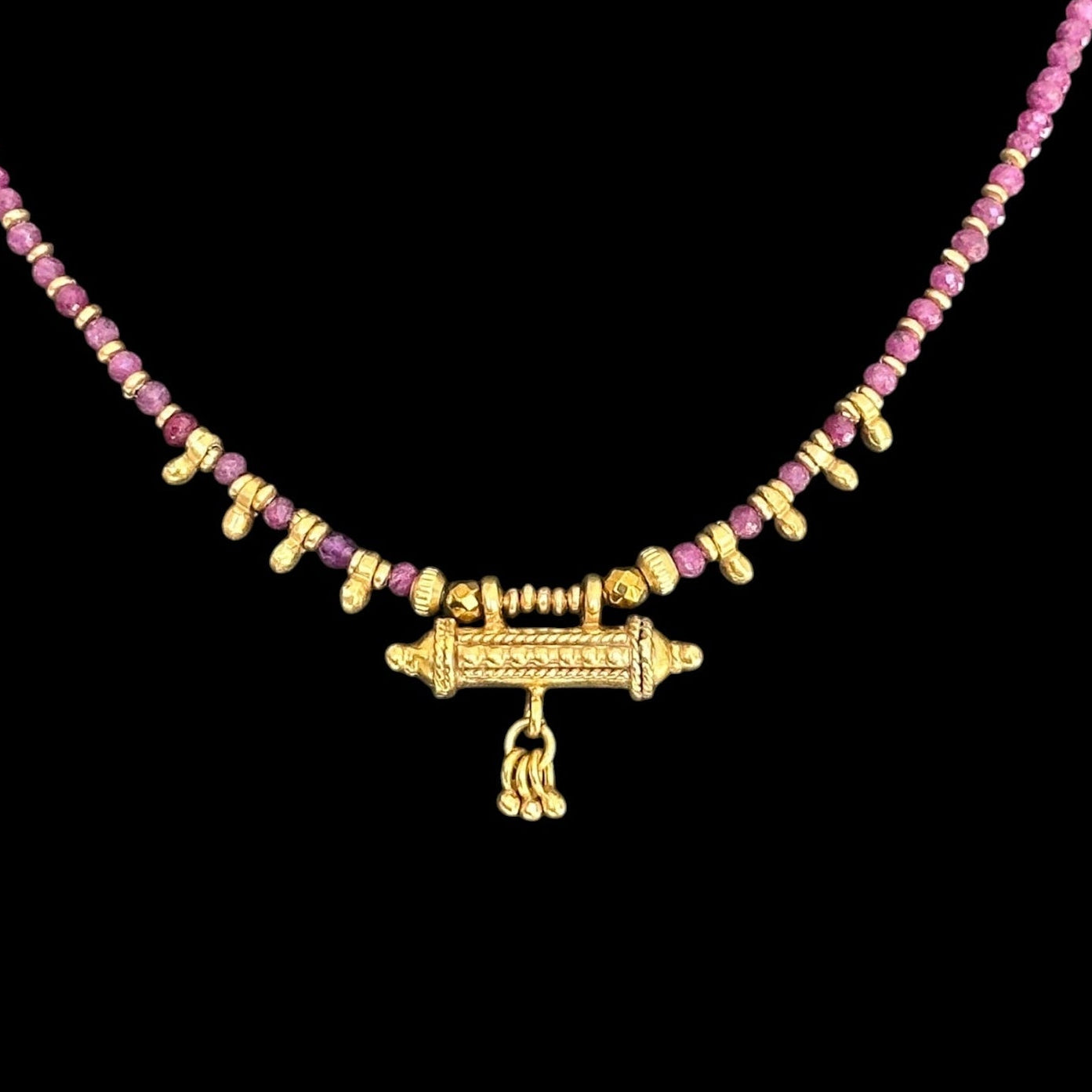 Fuerza y pasión en una sola pieza. Con cuentas de Indian rubí natural, piedra del amor y la vitalidad, y un colgante mantra box de latón sin piedra, que resalta por su diseño simbólico y elegante.