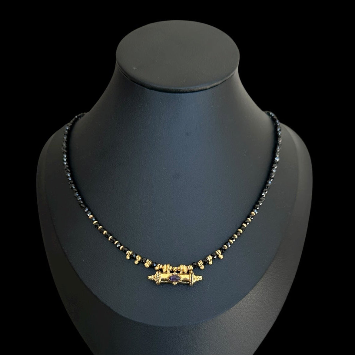 Potente y protector. Las piedras de ónix negro se combinan con una amatista incrustada en el colgante mantra box de latón, creando una pieza que transmite serenidad y fortaleza interior.