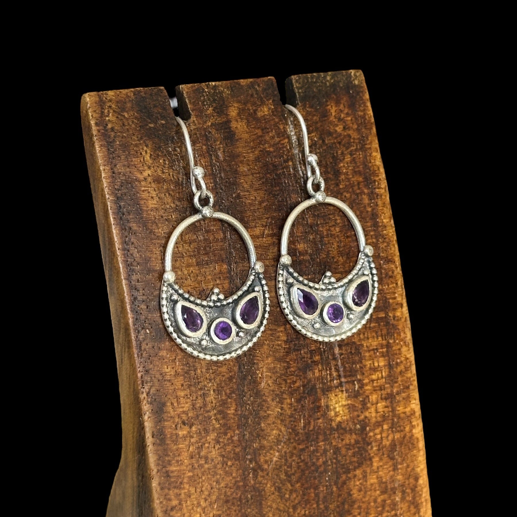 Pendientes de plata con tres amatistas engastadas en un diseño semicircular. Inspirados en los patrones antiguos de la India, aportan un toque de color y sofisticación artesanal.