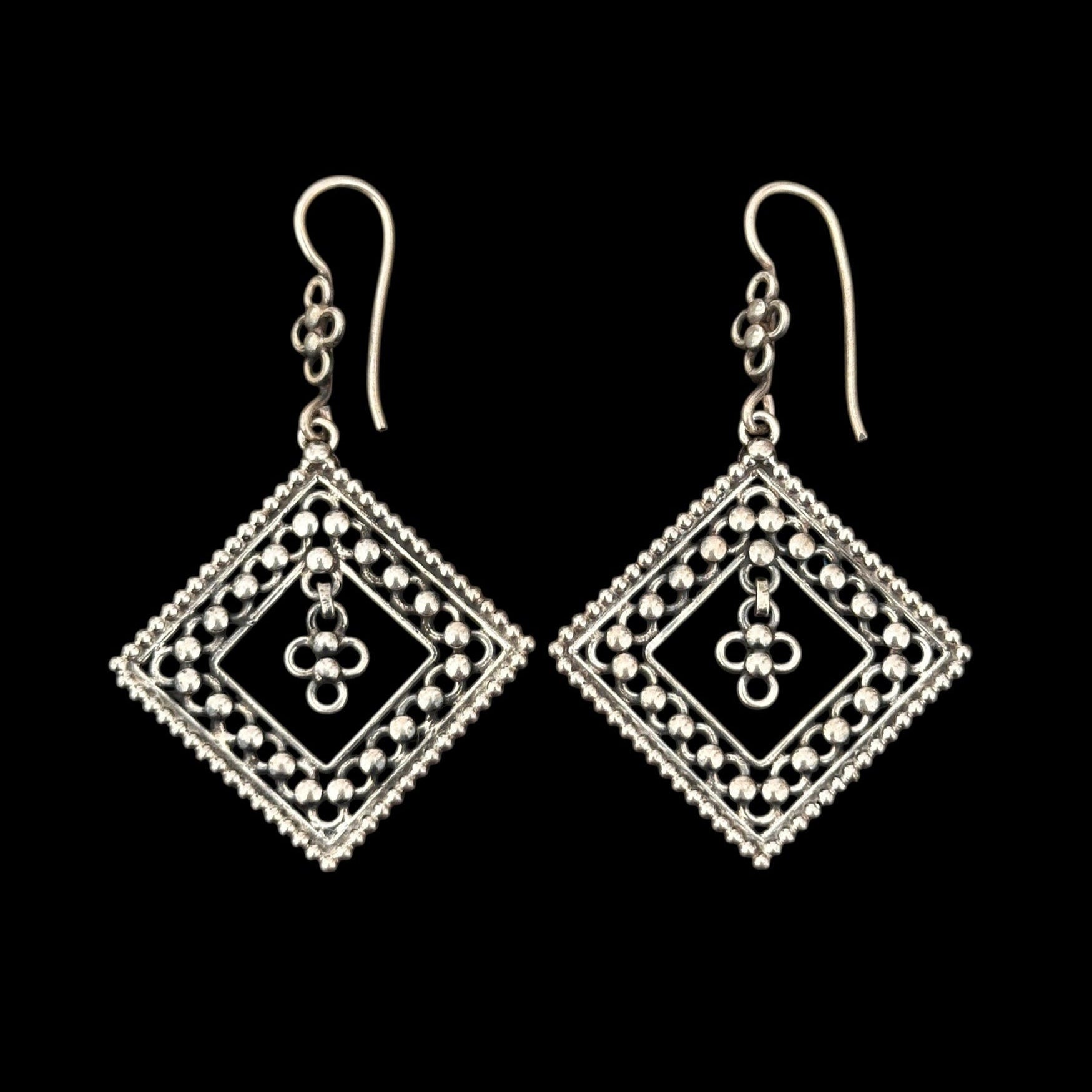 Pendientes artesanales en plata 925 con diseño en forma de rombo doble. Decorados con esferas soldadas y colgante central móvil en forma de cruz floral. Acabado pulido con gancho tipo hippie y detalles de filigrana tradicional.