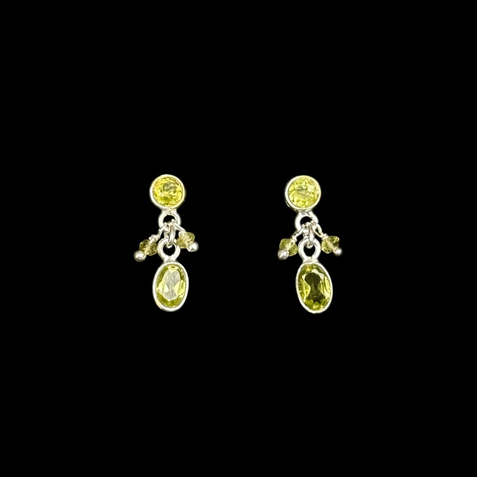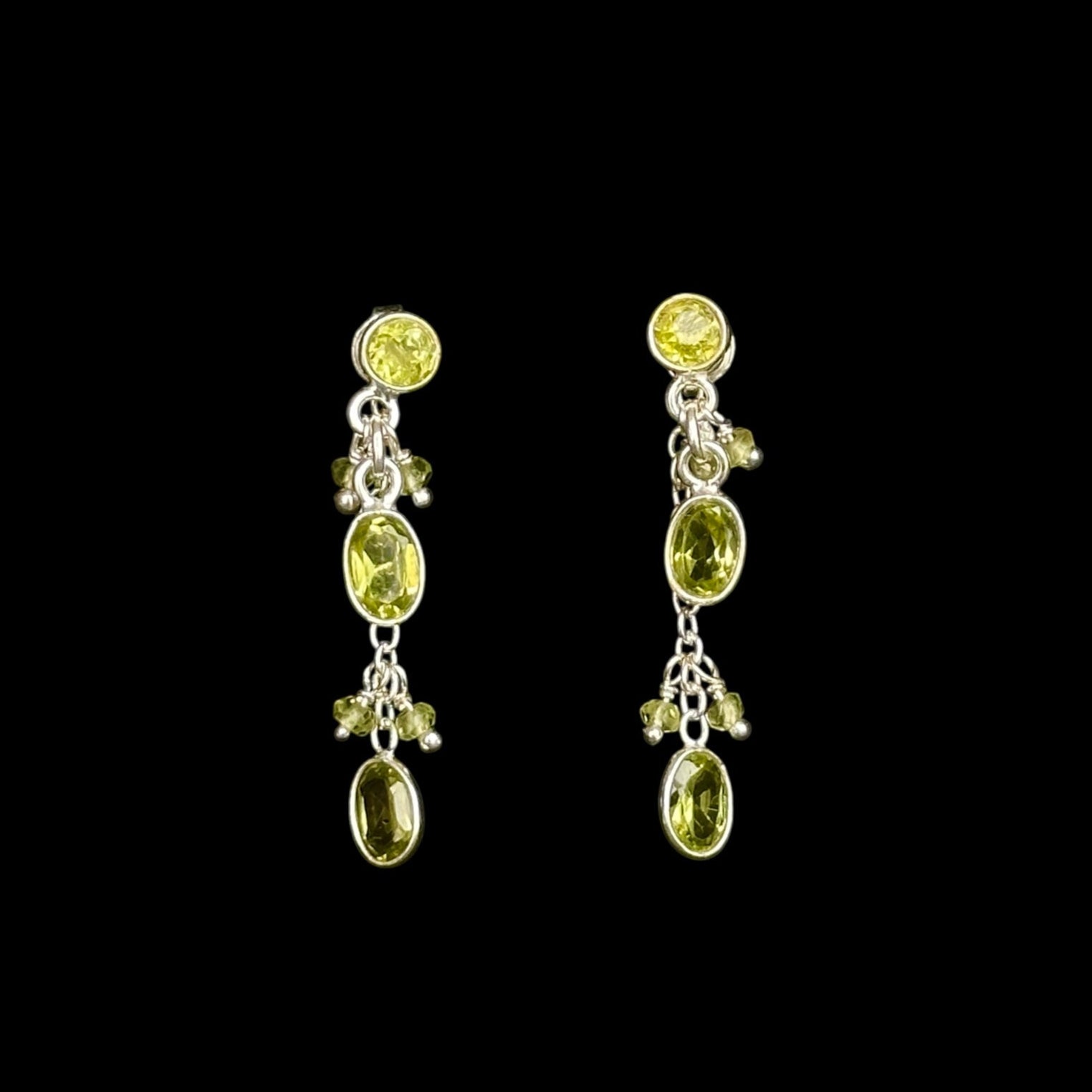 El diseño presenta piedras ovaladas facetadas que cuelgan delicadamente, acompañadas de pequeñas cuentas que aportan movimiento y brillo adicional. Están montados en plata de ley 925 y destacan por su acabado elegante y versátil.