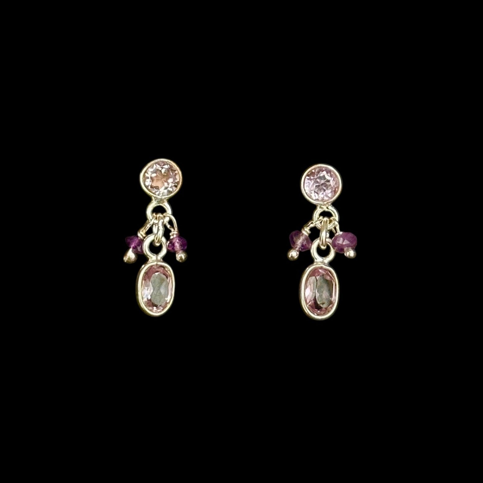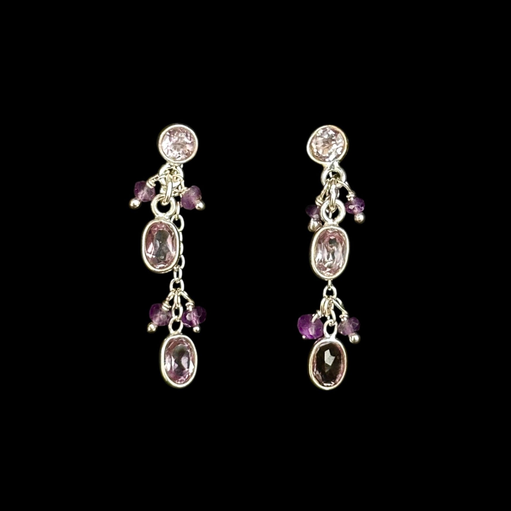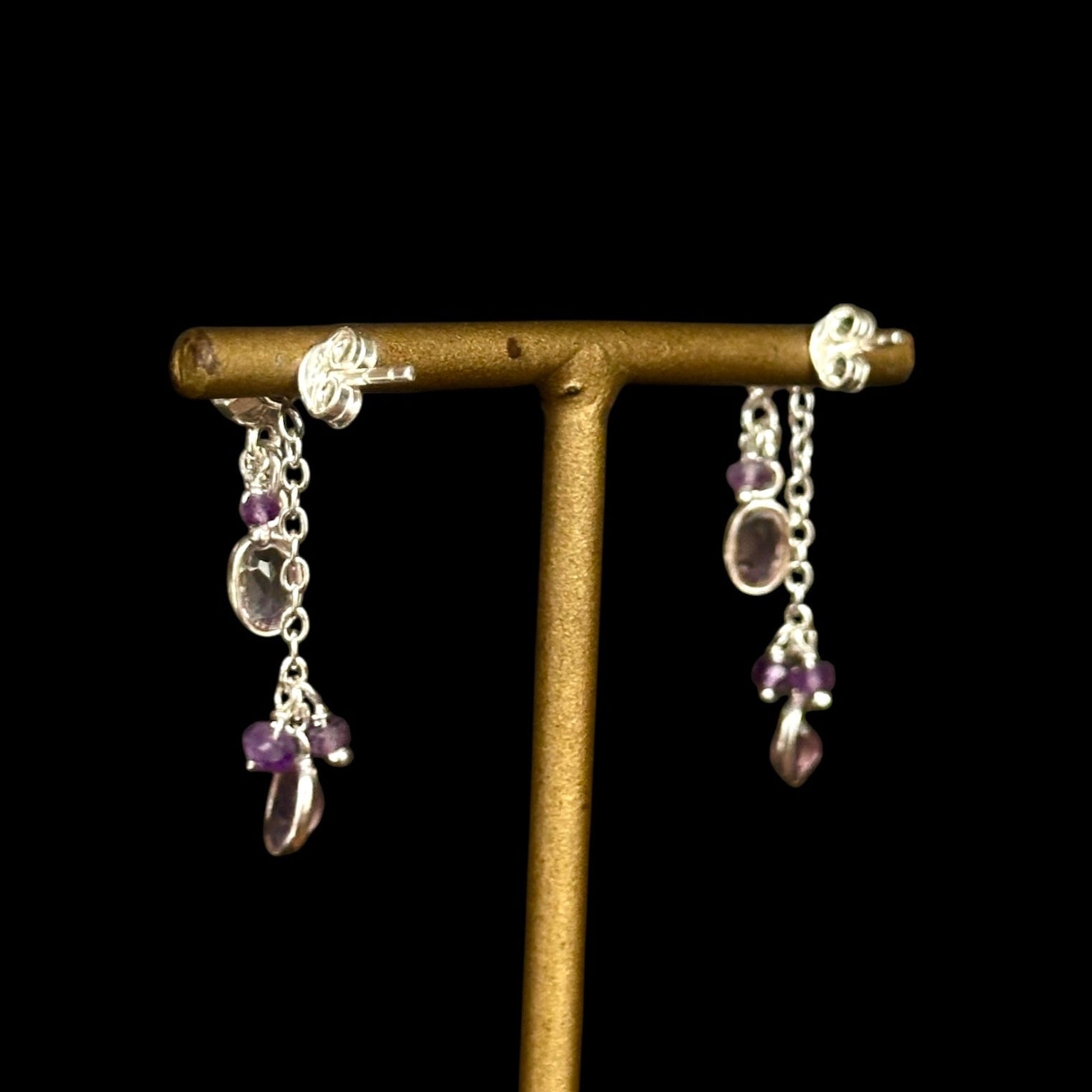 El diseño presenta piedras ovaladas facetadas que cuelgan delicadamente, acompañadas de pequeñas cuentas que aportan movimiento y brillo adicional. Están montados en plata de ley 925 y destacan por su acabado elegante y versátil.