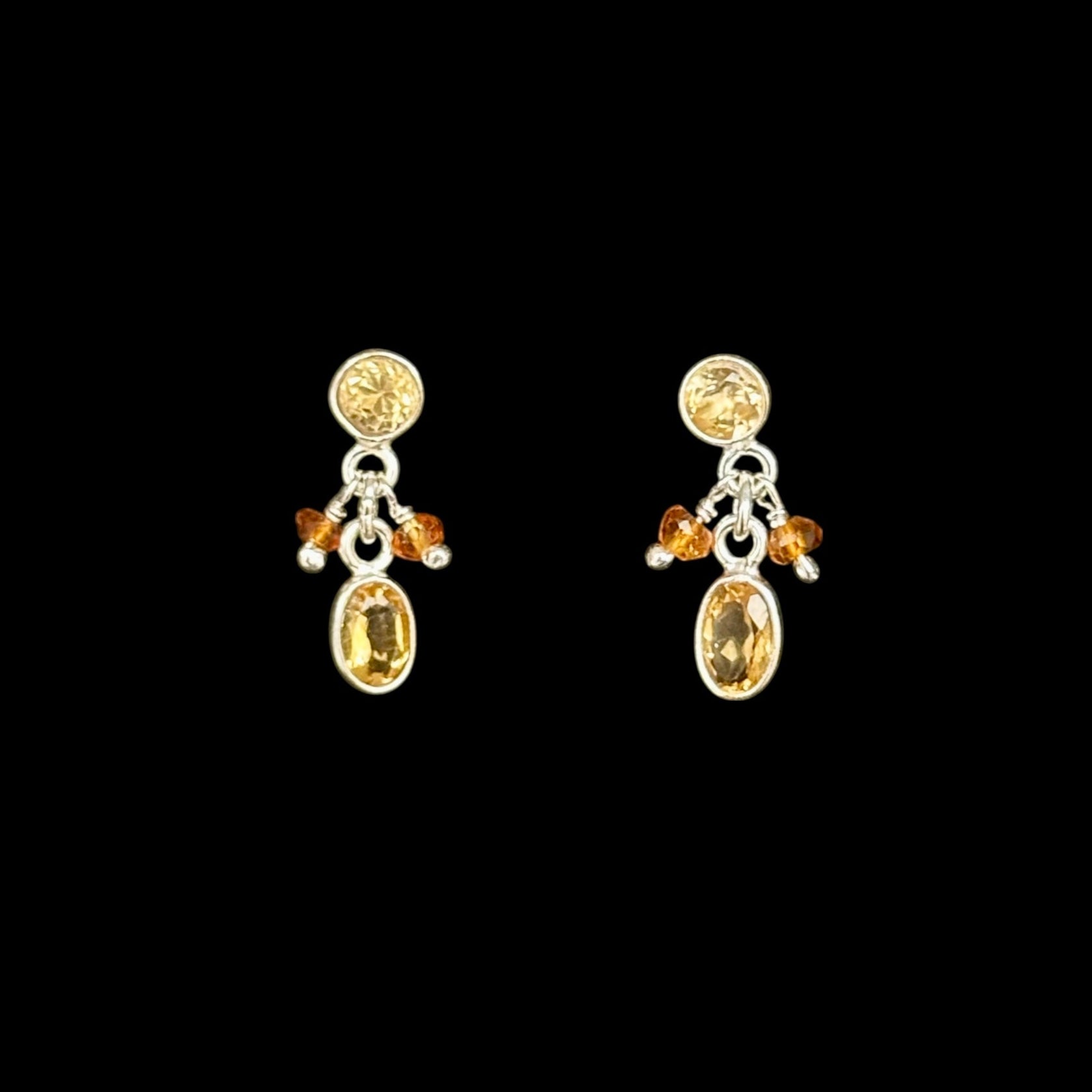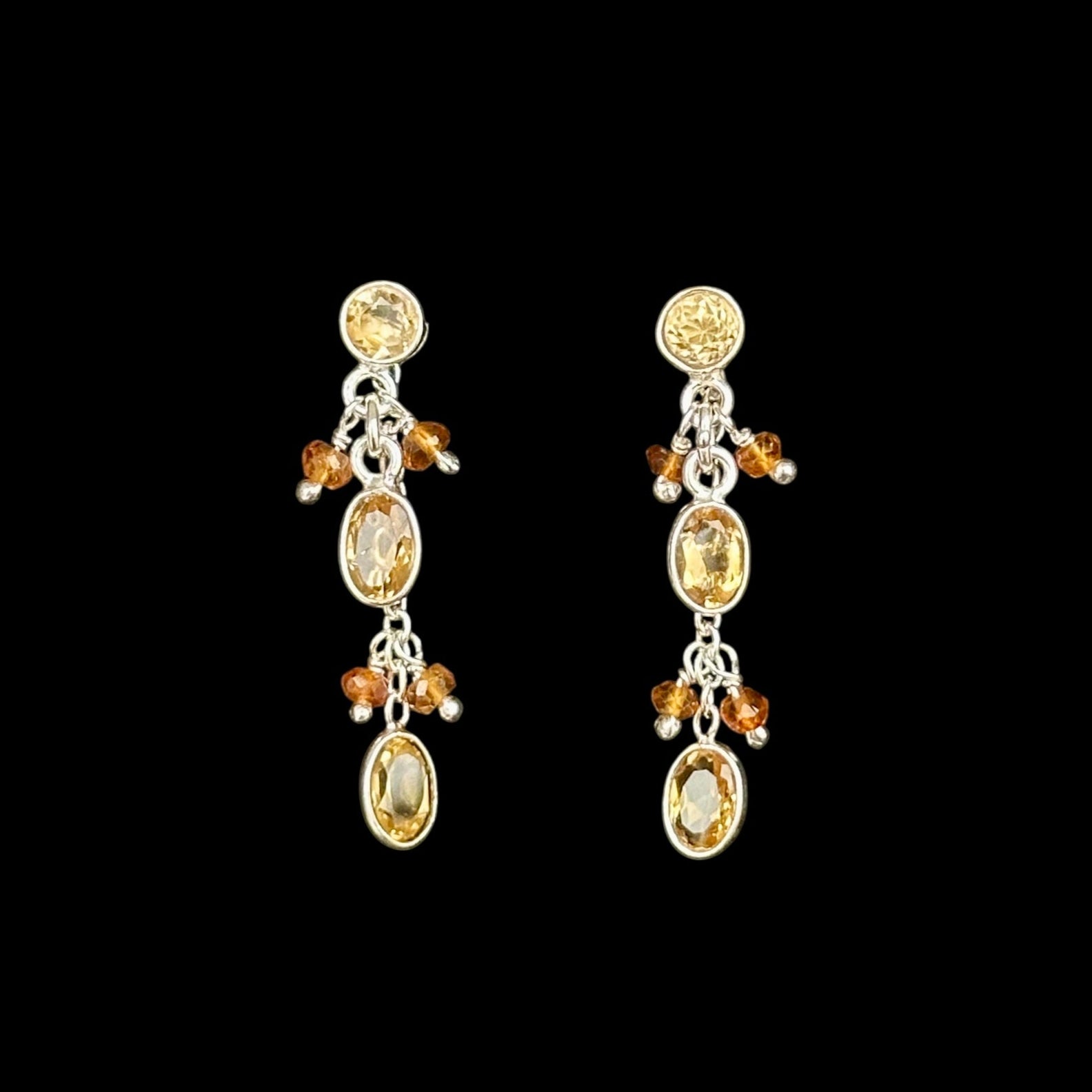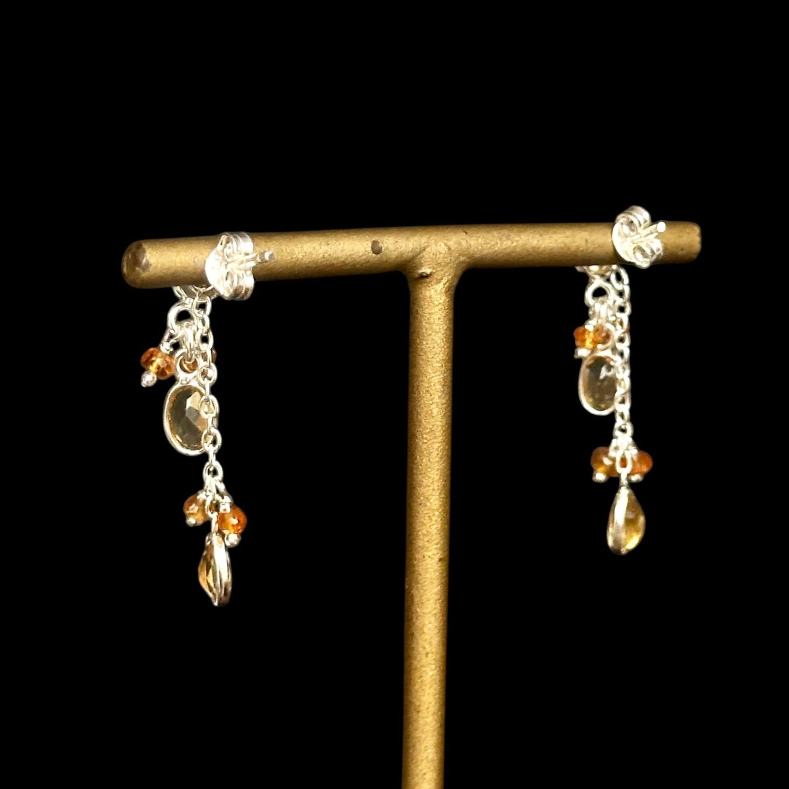 El diseño presenta piedras ovaladas facetadas que cuelgan delicadamente, acompañadas de pequeñas cuentas que aportan movimiento y brillo adicional. Están montados en plata de ley 925 y destacan por su acabado elegante y versátil.