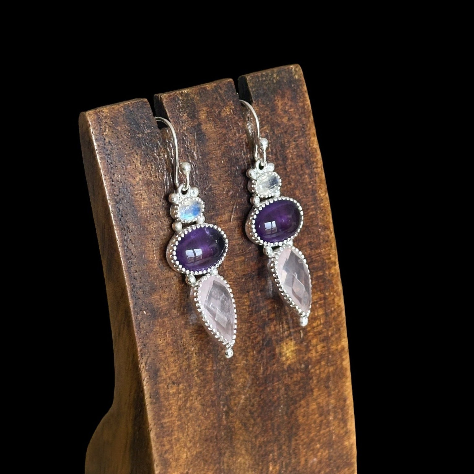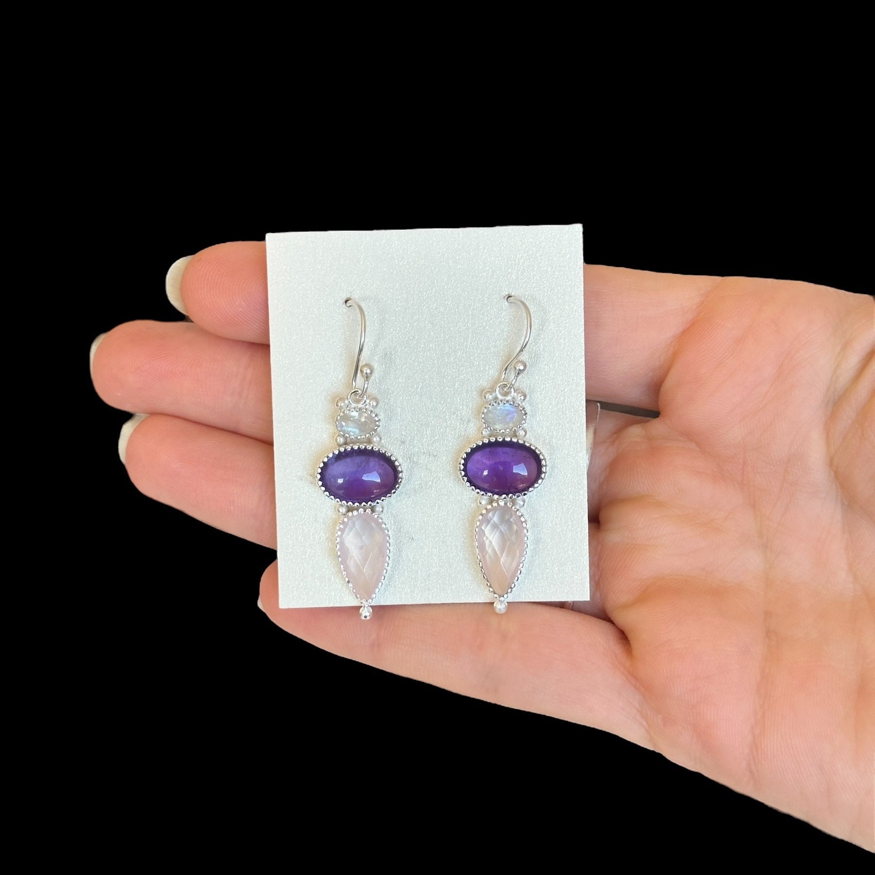 Una combinación armoniosa de energía y color: Amatista, Cuarzo Rosa y Piedra de Luna se unen en una pieza única que transmite calma, amor y claridad emocional. El trabajo en plata 925 realza la belleza natural de cada gema, creando un pendiente elegante y femenino.