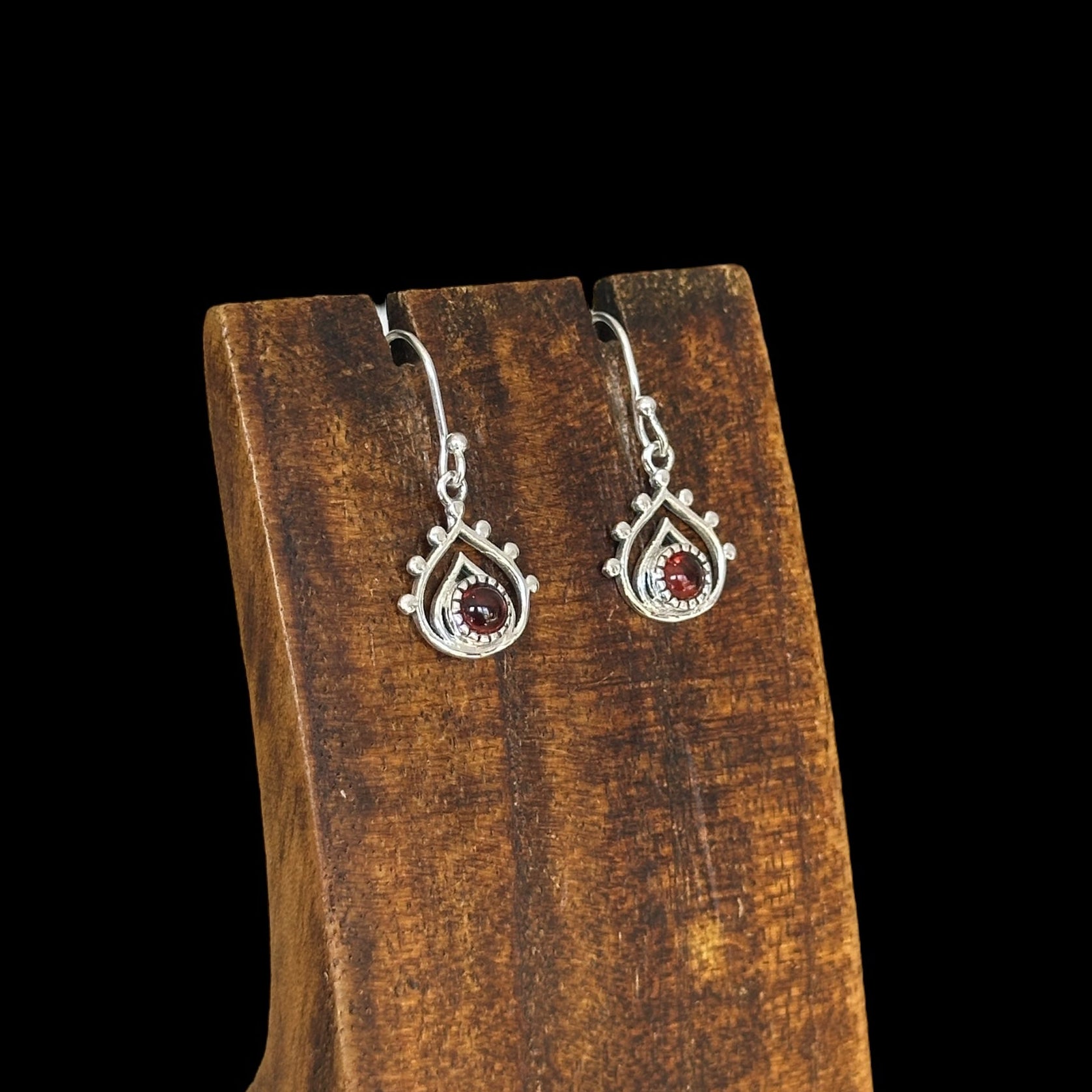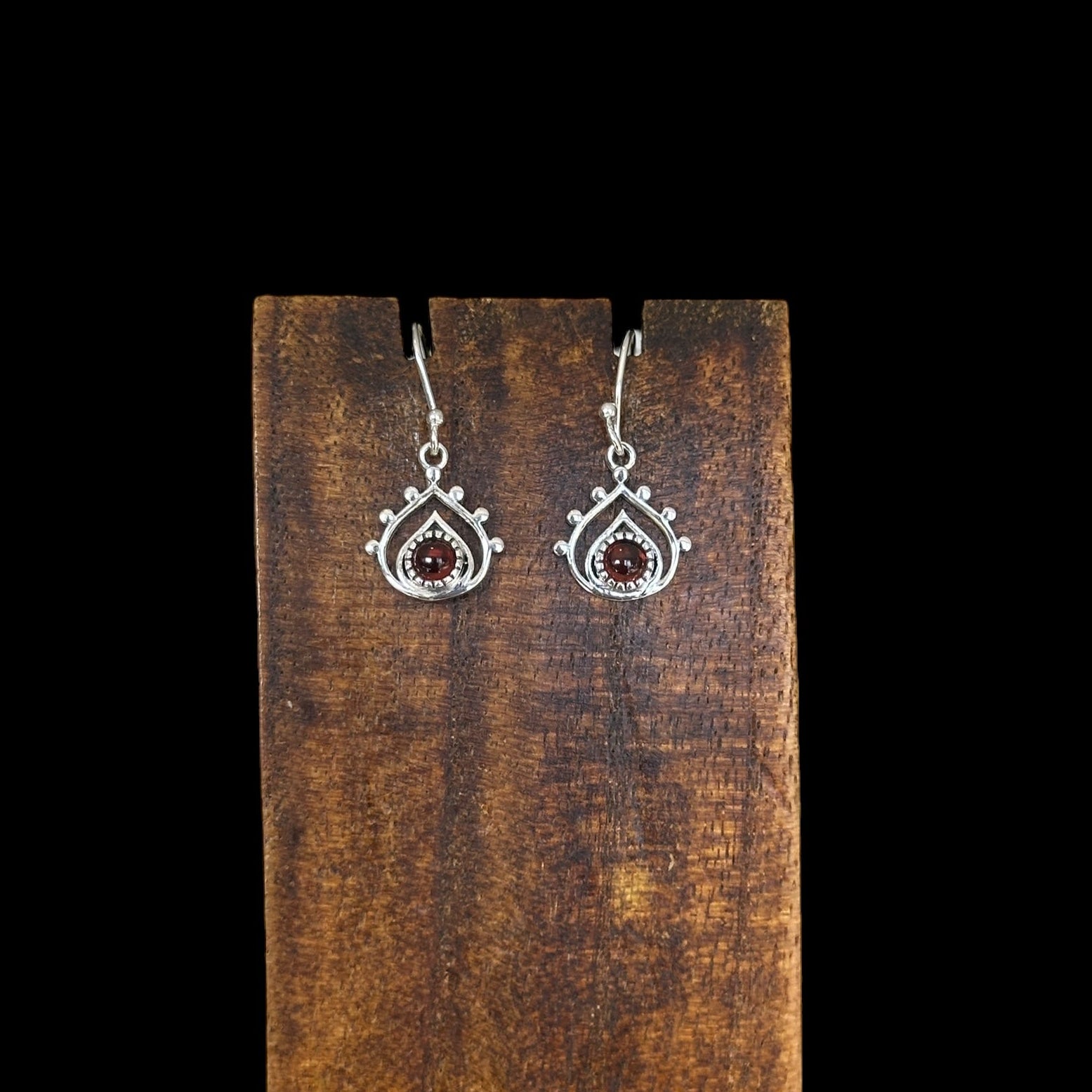 Pendientes de plata con Granate central rodeada de un marco artesanal. Su diseño en forma de gota con pequeños detalles en el exterior , es ideal para un estilo étnico y colorido, evocando la esencia de la joyería india tradicional.