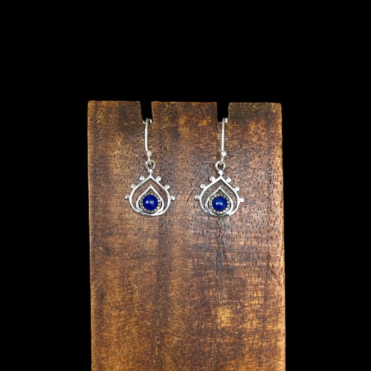 Pendientes de plata con Lapislazuli central rodeada de un marco artesanal. Su diseño en forma de gota con pequeños detalles en la parte exterior es ideal para un estilo étnico y colorido, evocando la esencia de la joyería india tradicional.