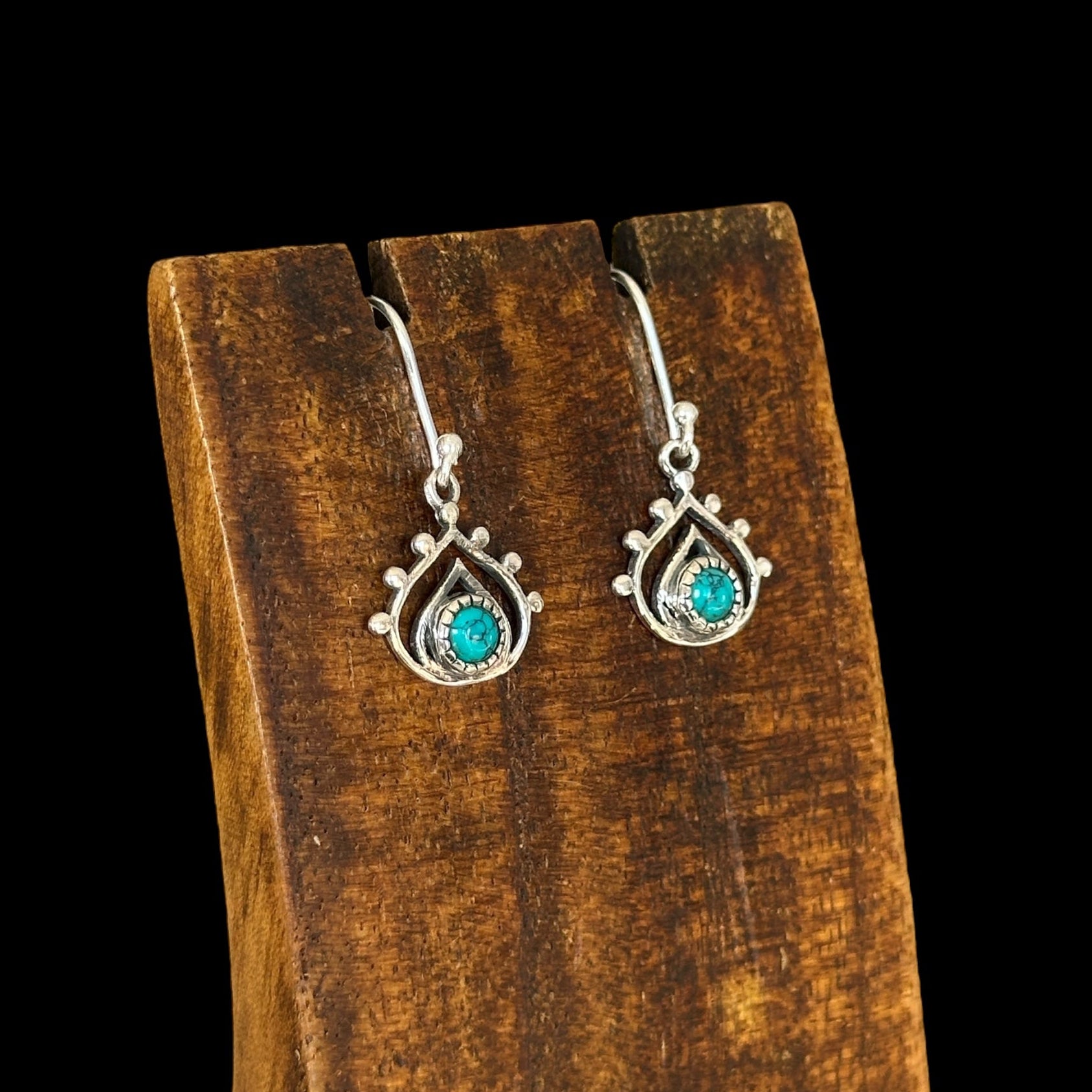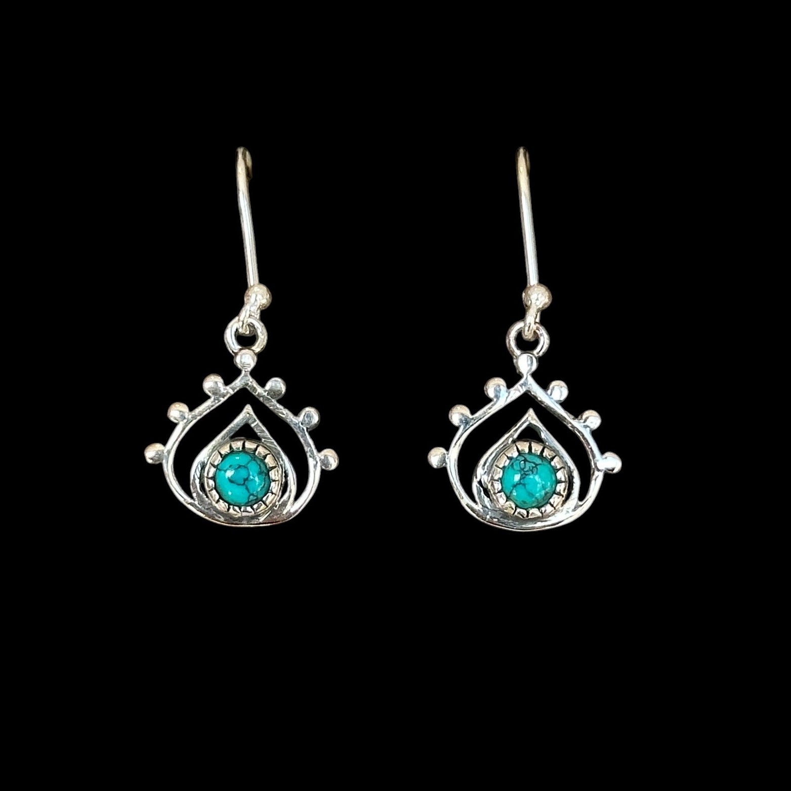 Pendientes de plata con turquesa central rodeada de un marco artesanal. Su diseño en forma de gota con pequeños detalles en la parte exterior es ideal para un estilo étnico y colorido, evocando la esencia de la joyería india tradicional.