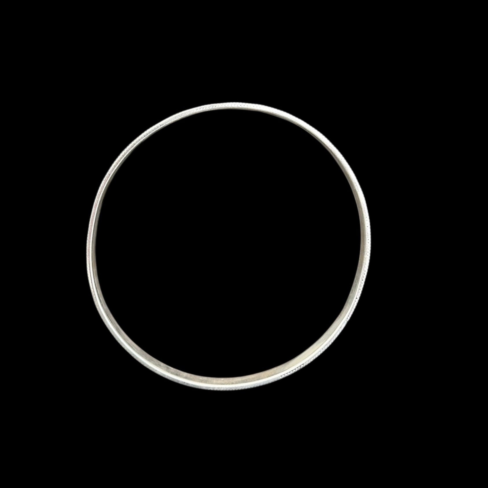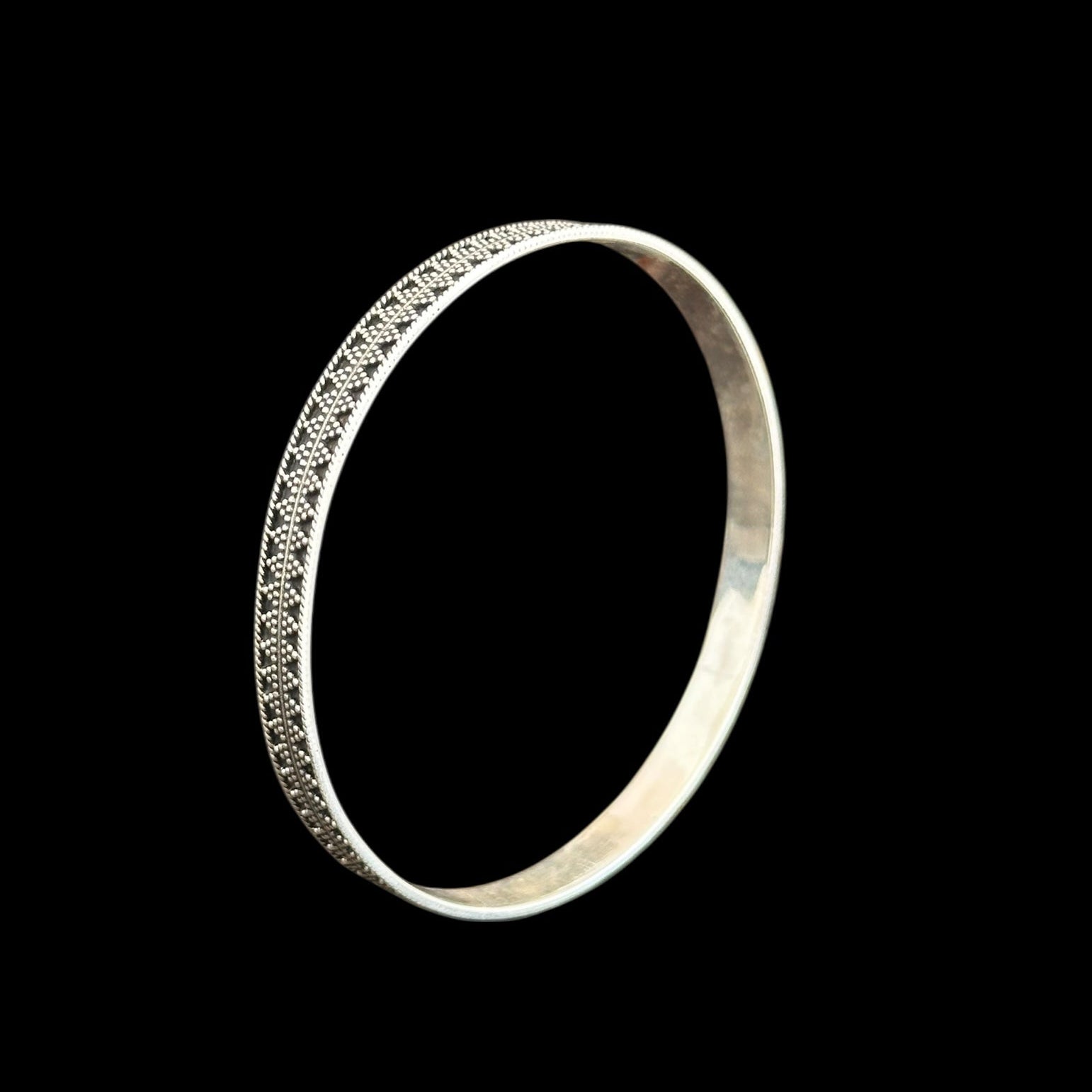 pulsera rígida elaborada artesanalmente en plata de ley 925. Su diseño étnico destaca por un delicado grabado geométrico en relieve que aporta textura y profundidad, evocando la joyería tradicional india con un acabado elegante y sobrio.