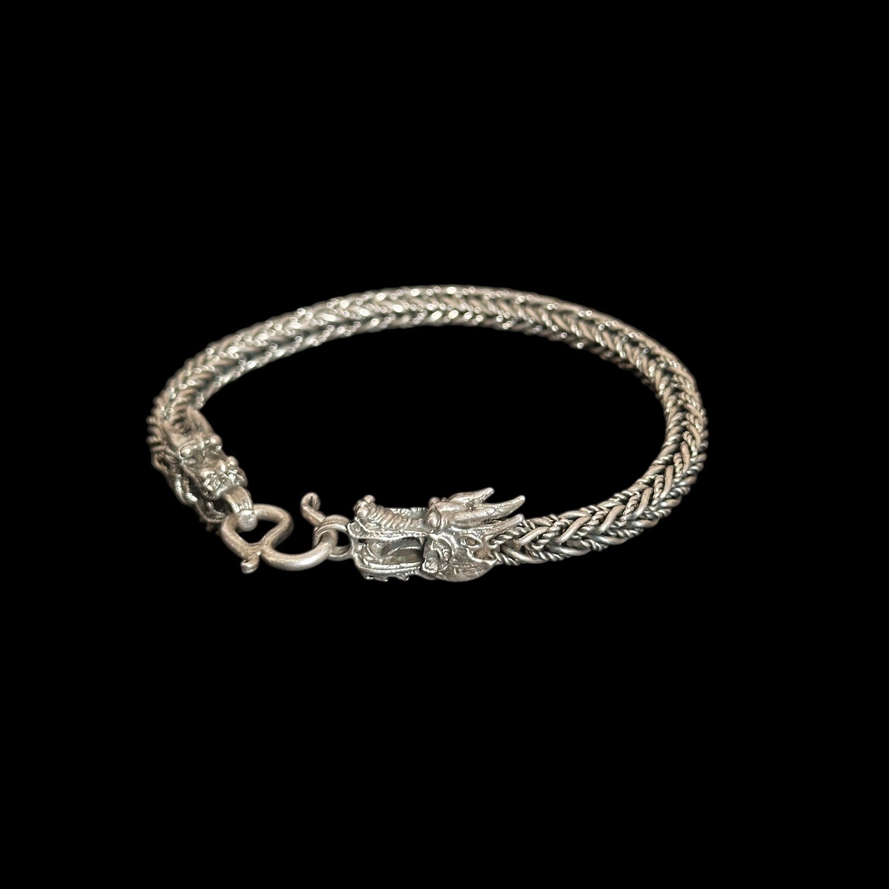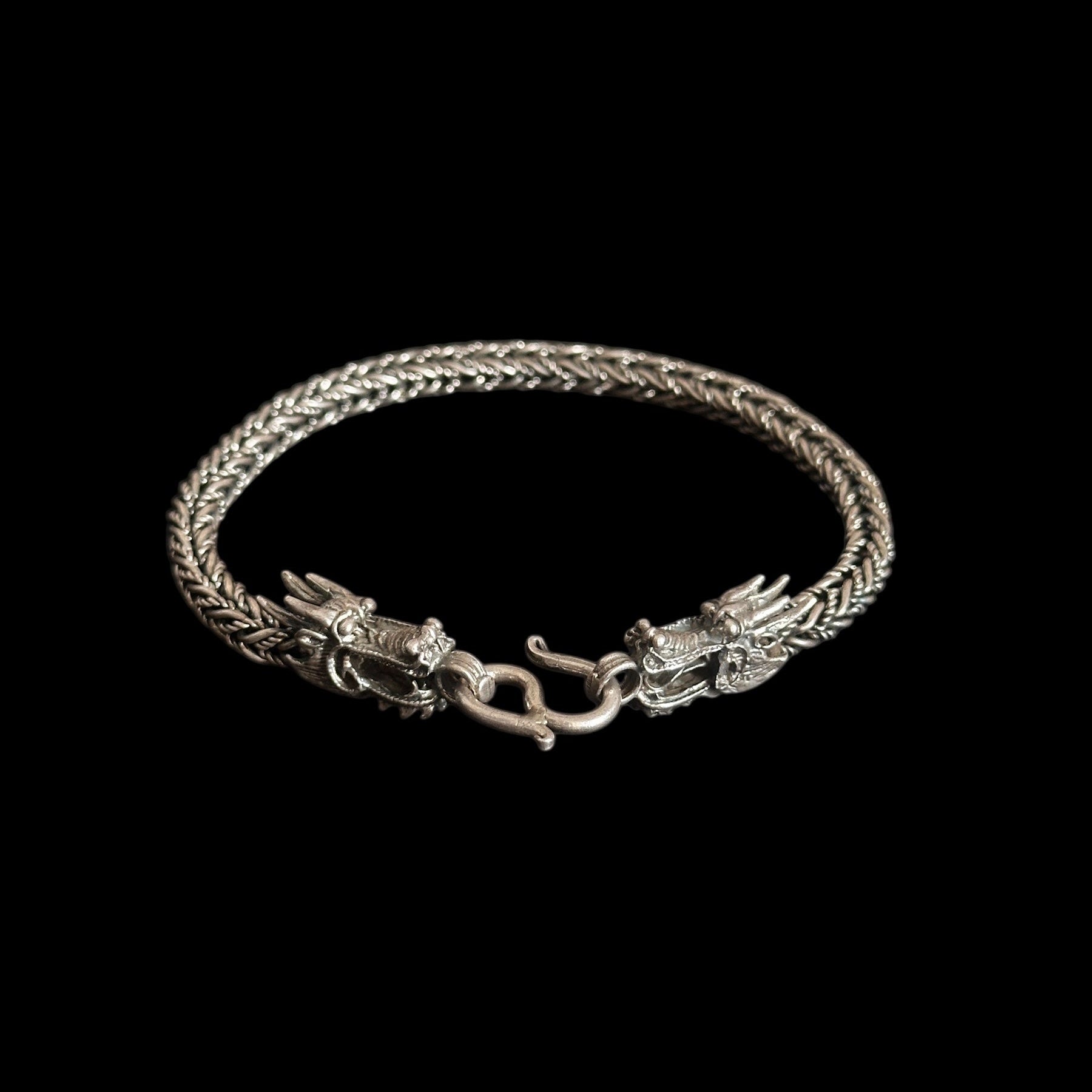 Descubre esta impresionante pulsera de plata, diseñada con dos cabezas de dragón finamente detalladas. Una pieza con carácter, inspirada en la joyería tradicional asiática y pensada para quienes buscan un accesorio con fuerza y personalidad.