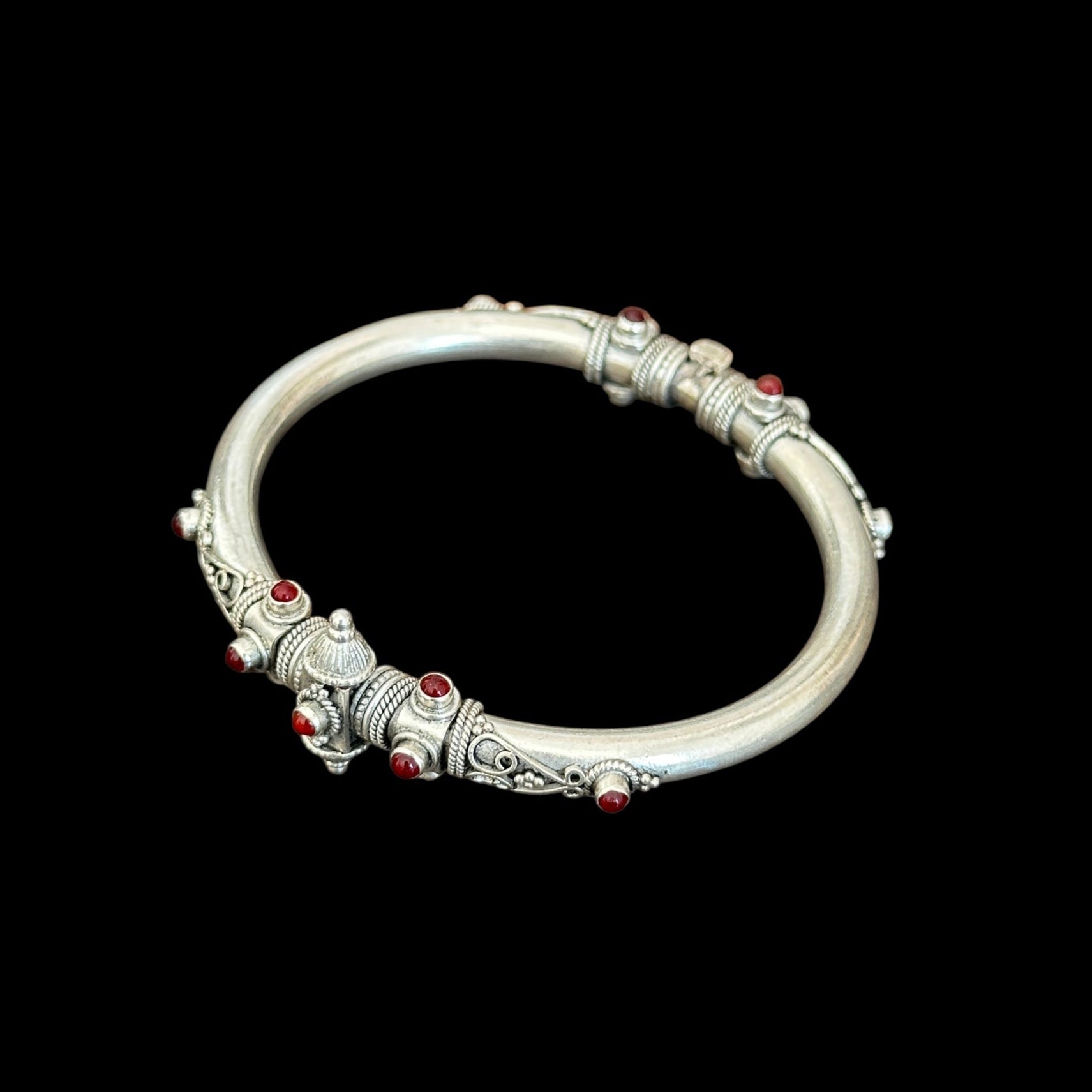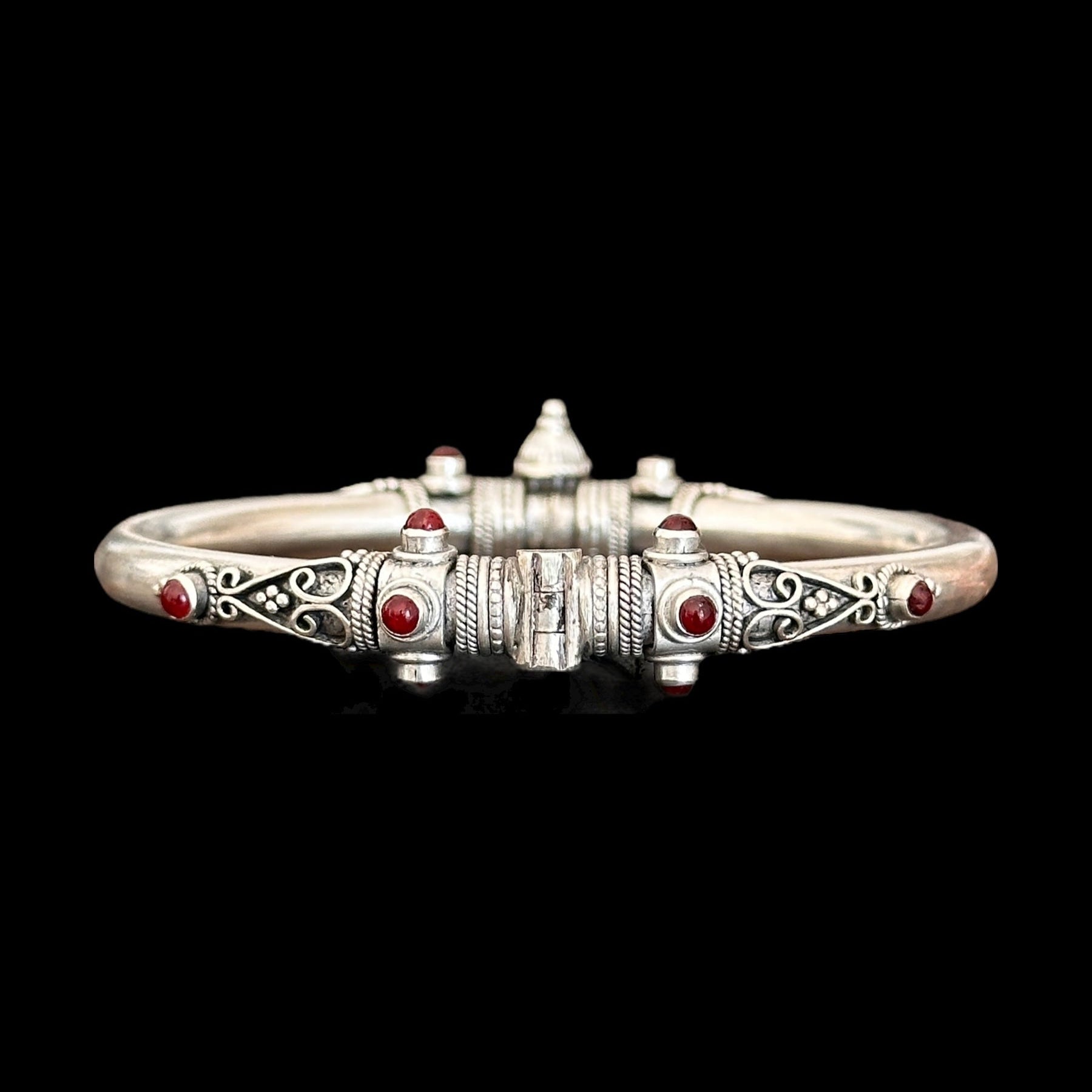 Pulsera étnica de plata trabajada artesanalmente, adornada con cornalina natural en cabujón que realza su carácter tradicional. Su diseño rígido incorpora delicados relieves y detalles que rodean la pieza, mientras que las incrustaciones de cornalina aportan un contraste cálido y vibrante sobre el tono envejecido de la plata. La pulsera cuenta con un sistema de apertura en forma de rosca, inspirado en técnicas ancestrales, y posee un diámetro interno de 6.0 cm, lo que la convierte en una joya auténtica de estilo tribal con influencia de la joyería tradicional de la India.