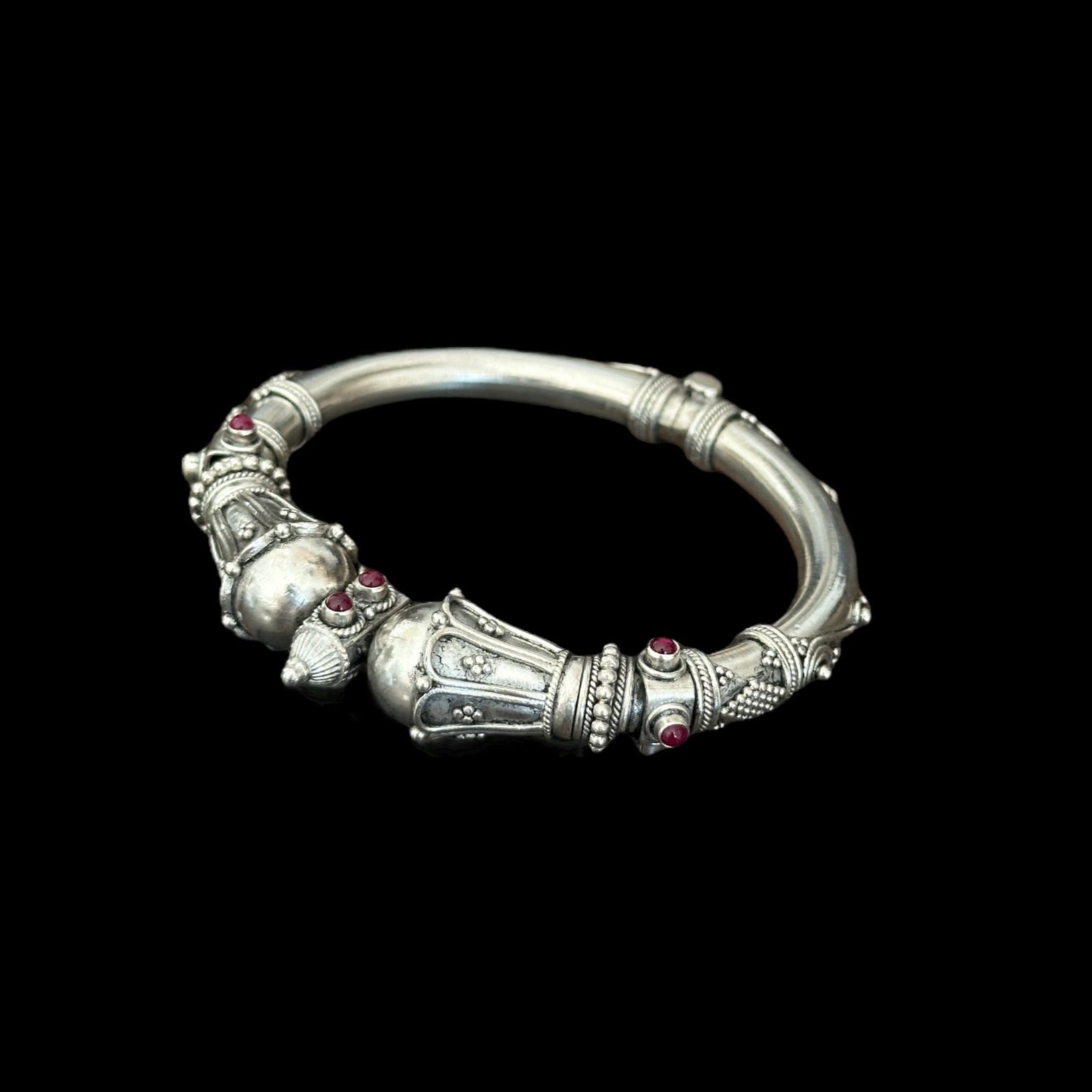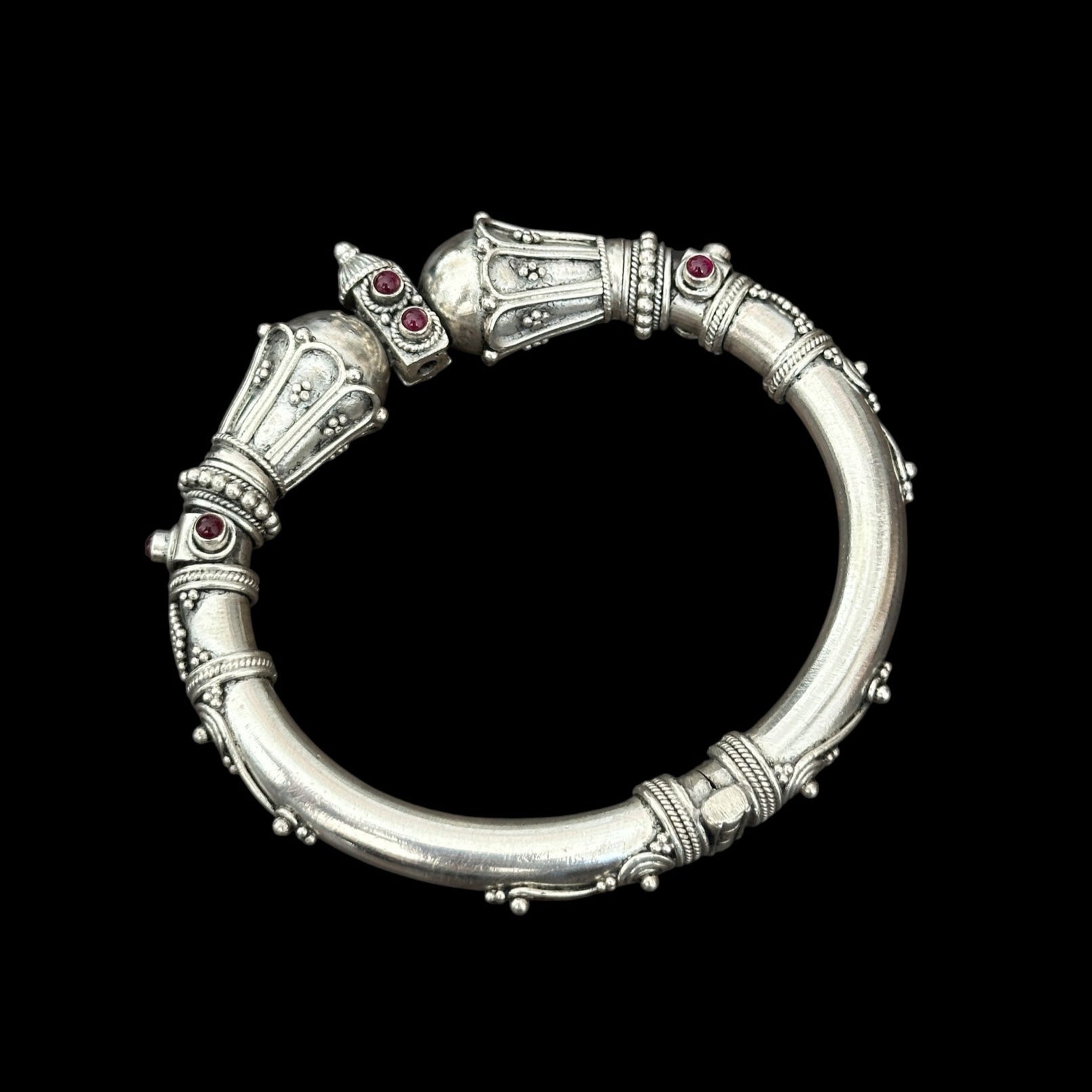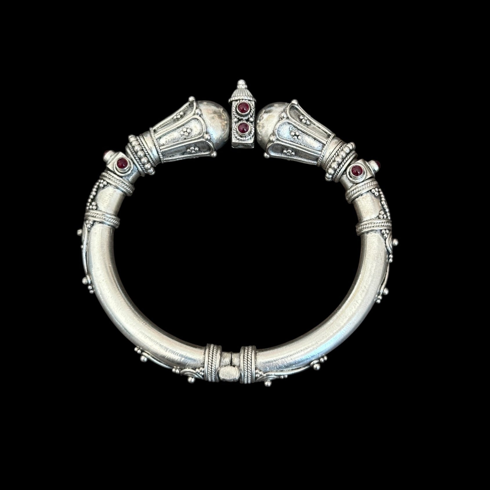 Una pieza única con diseño artesanal, trabajada en plata con terminaciones voluminosas que destacan por su forma cónica, decoradas con finos relieves y pequeñas esferas en plata que evocan el trabajo artesanal tradicional. Cada extremo está realzado con diminutas incrustaciones de Grantes rojas naturales, que aportan un contraste elegante y un aire majestuoso a la pieza. La combinación de volúmenes y texturas convierte a esta pulsera en un accesorio único, lleno de carácter y sofisticación. y detalles minuciosos en relieve. Sus formas arquitectónicas y pequeñas incrustaciones crean un estilo auténtico y sofisticado, perfecto para resaltar la fuerza y la elegancia en cualquier ocasión.