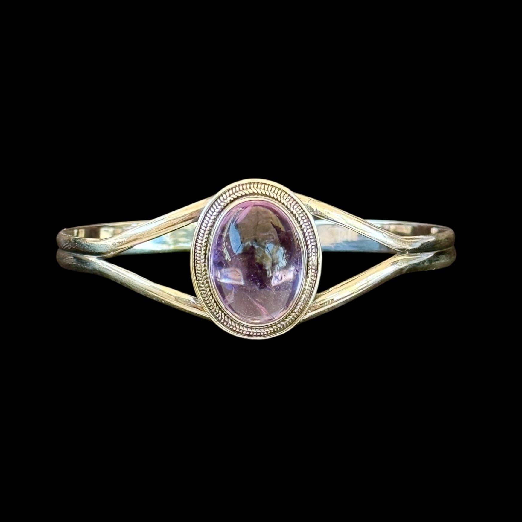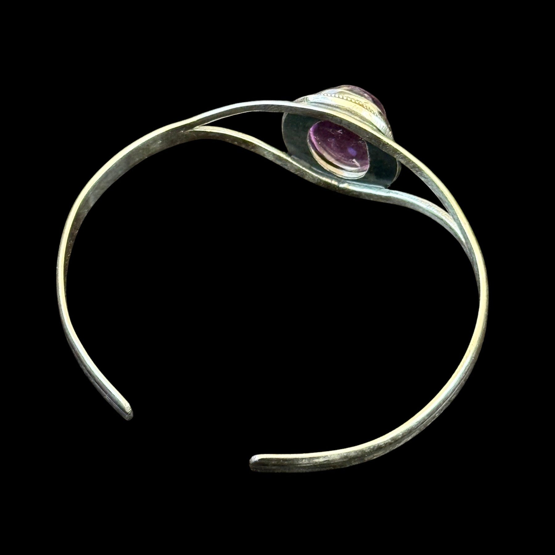 Pulsera de plata rígida con un diseño elegante y minimalista. En el centro destaca una amatista natural engarzada, reconocida por su intenso color violeta y su simbolismo de calma y equilibrio. Una pieza única que une la sobriedad de la plata con la energía mística de la amatista, perfecta para realzar cualquier estilo.